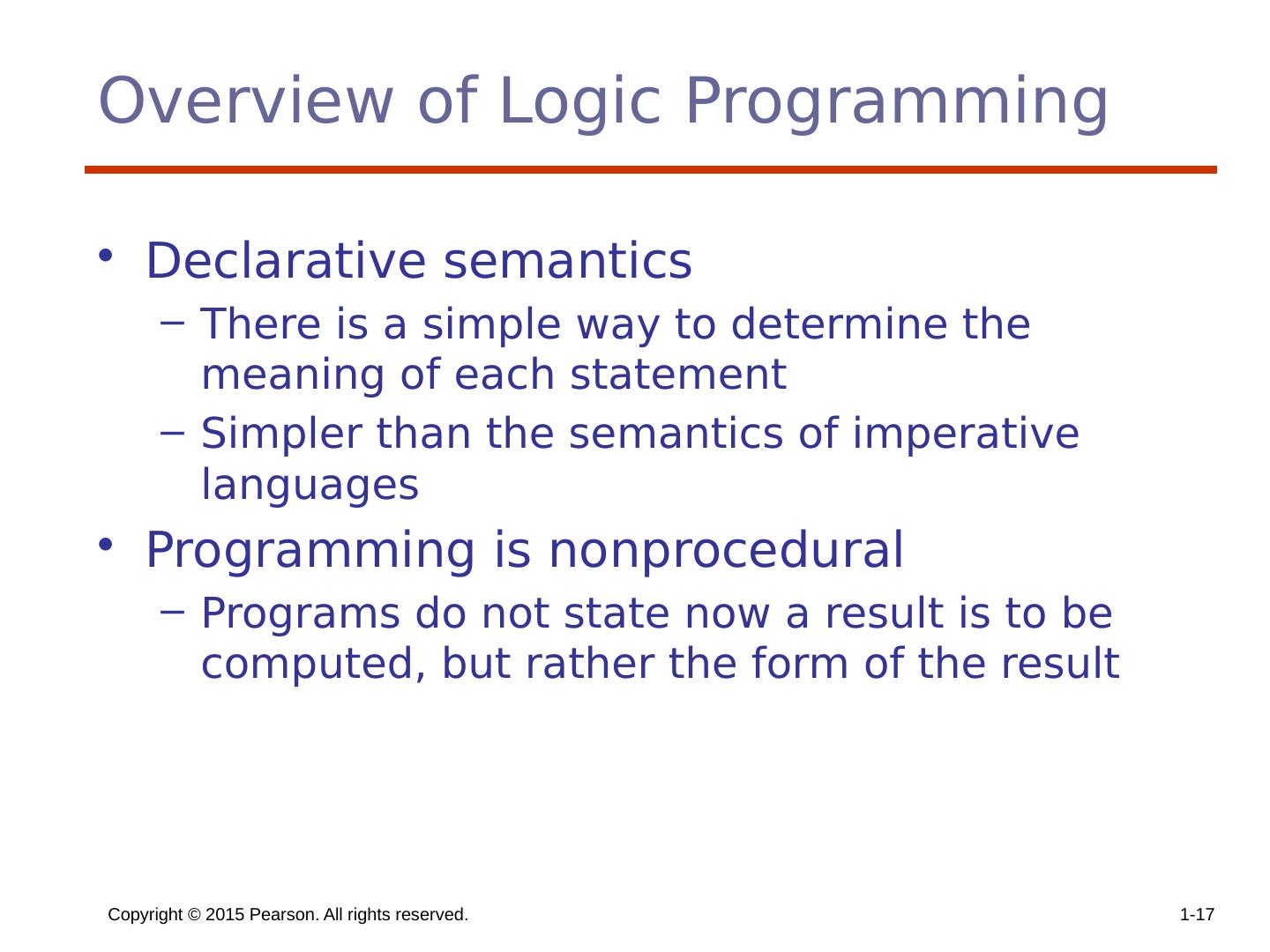 17 .Copyright © 2015 Pearson. All rights reserved. 1- 17 Overview of Logic Programming Declarative semantics There is a simple way to determine the meaning of each statement Simpler than the semantics of imperative languages Programming is nonprocedural Programs do not state now a result is to be computed, but rather the form of the result