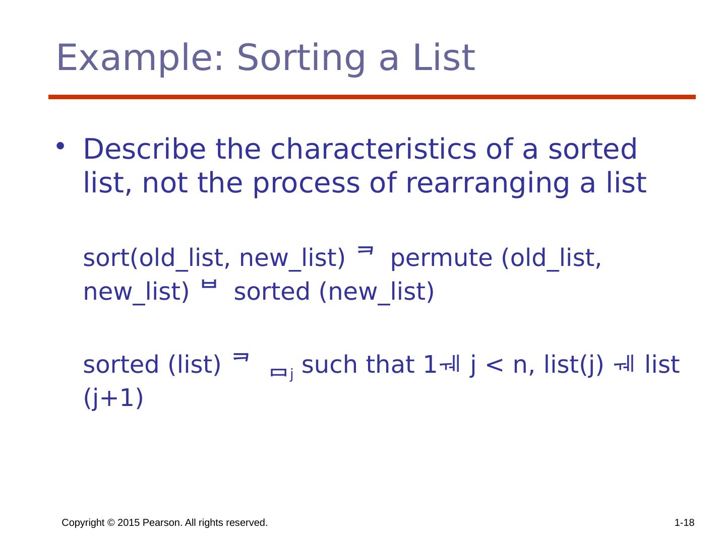 18 .Copyright © 2015 Pearson. All rights reserved. 1- 18 Example: Sorting a List Describe the characteristics of a sorted list, not the process of rearranging a list sort(old_list, new_list) permute (old_list, new_list) sorted (new_list) sorted (list) j such that 1 j < n, list(j) list (j+1)
