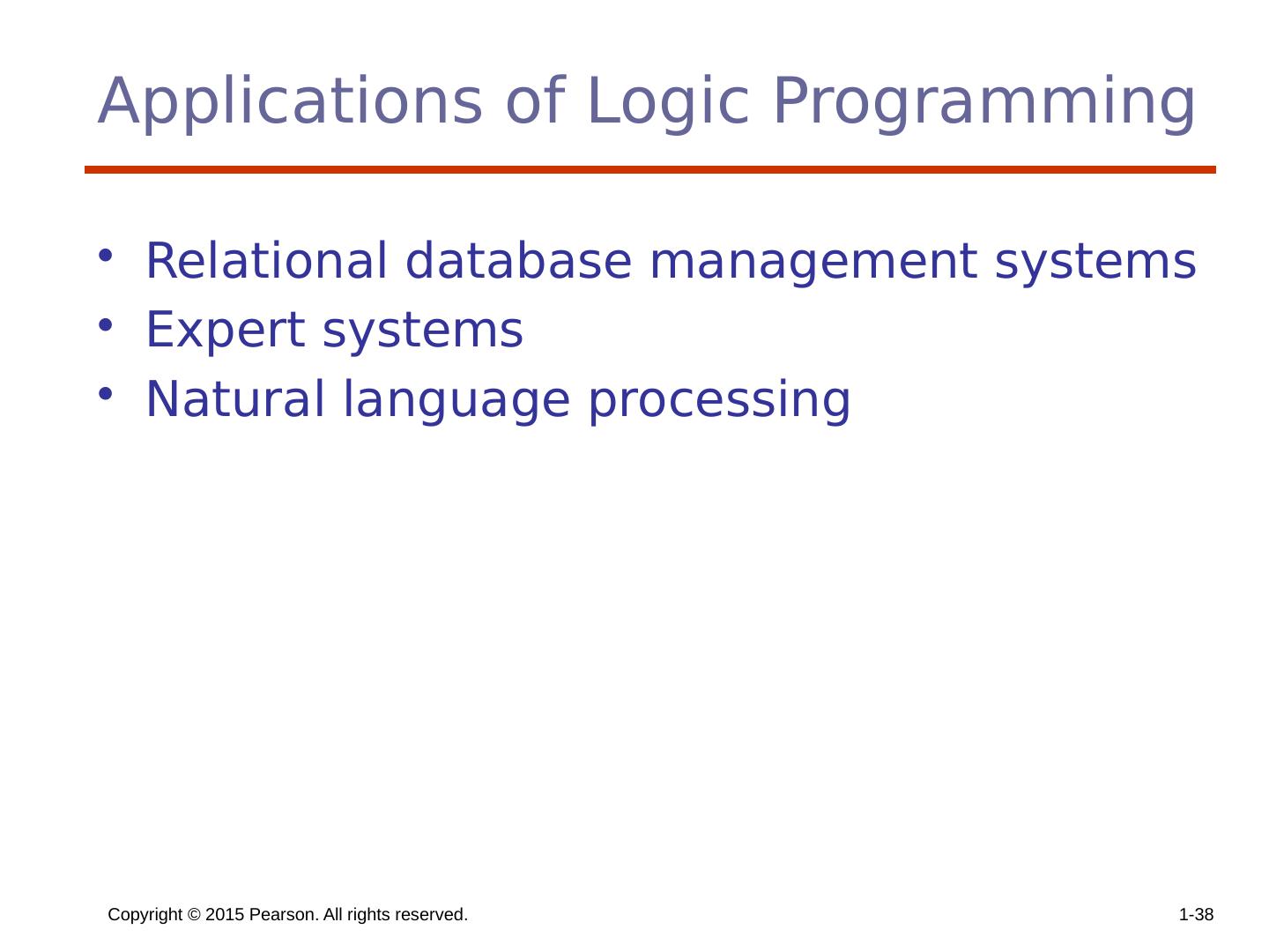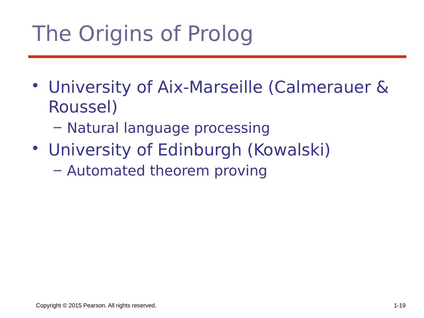 19 .Copyright © 2015 Pearson. All rights reserved. 1- 19 The Origins of Prolog University of Aix-Marseille (Calmerauer & Roussel) Natural language processing University of Edinburgh (Kowalski) Automated theorem proving