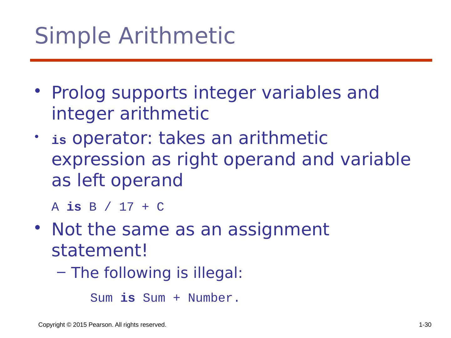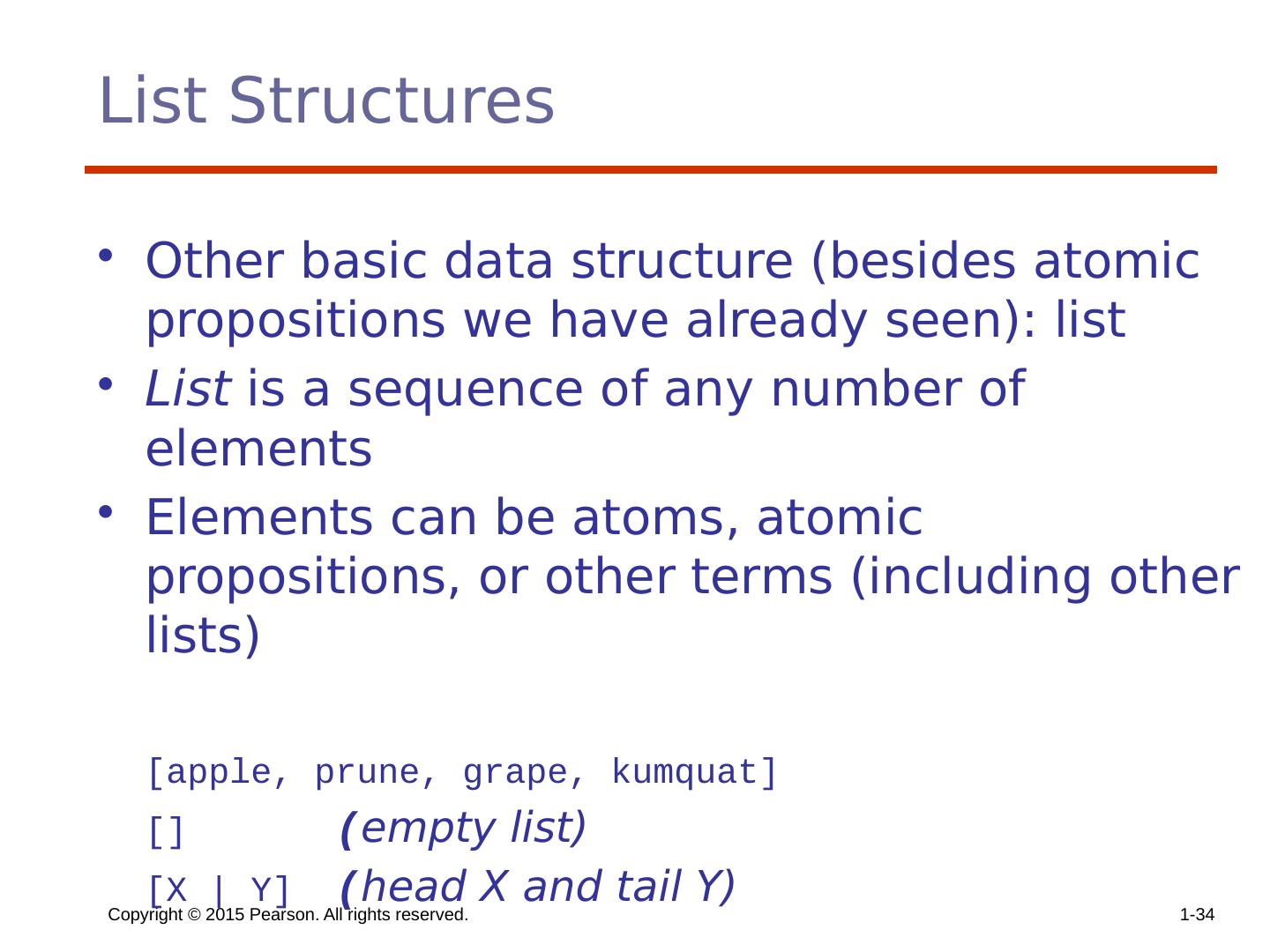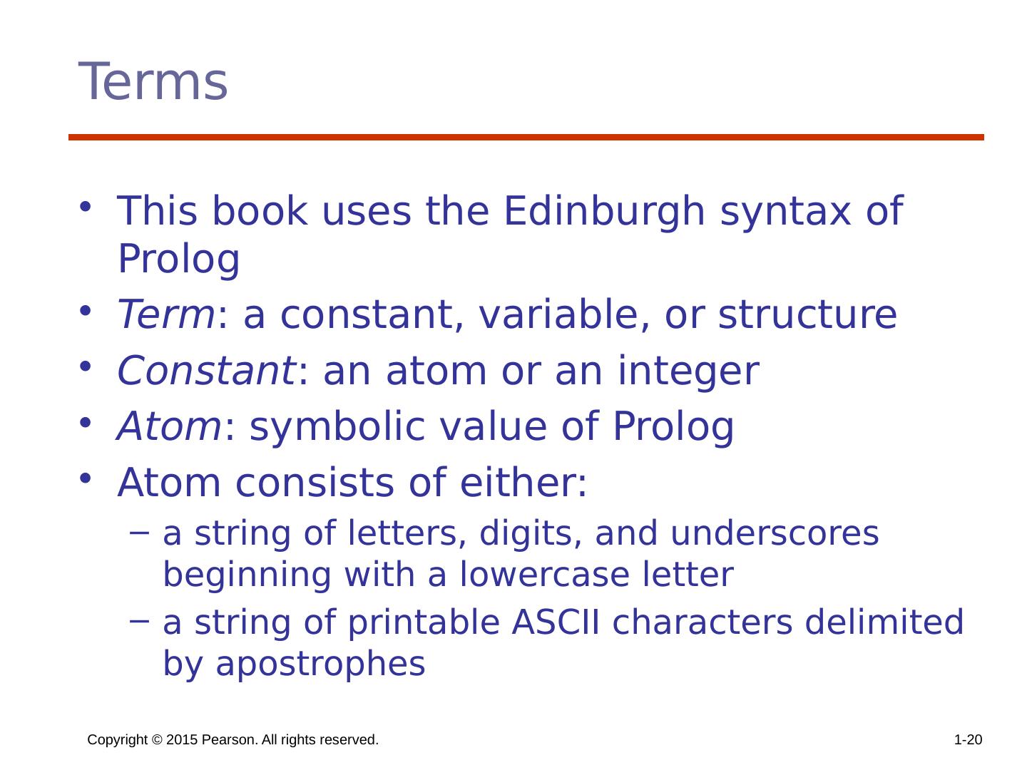 20 .Copyright © 2015 Pearson. All rights reserved. 1- 20 Terms This book uses the Edinburgh syntax of Prolog Term : a constant, variable, or structure Constant : an atom or an integer Atom : symbolic value of Prolog Atom consists of either: a string of letters, digits, and underscores beginning with a lowercase letter a string of printable ASCII characters delimited by apostrophes
