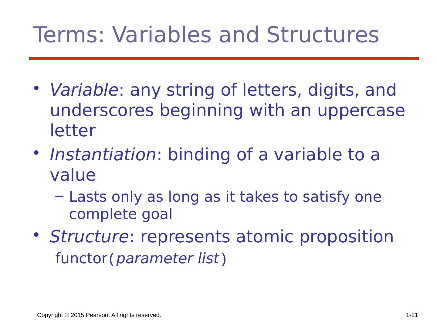 21 .Copyright © 2015 Pearson. All rights reserved. 1- 21 Terms: Variables and Structures Variable : any string of letters, digits, and underscores beginning with an uppercase letter Instantiation : binding of a variable to a value Lasts only as long as it takes to satisfy one complete goal Structure : represents atomic proposition functor ( parameter list )