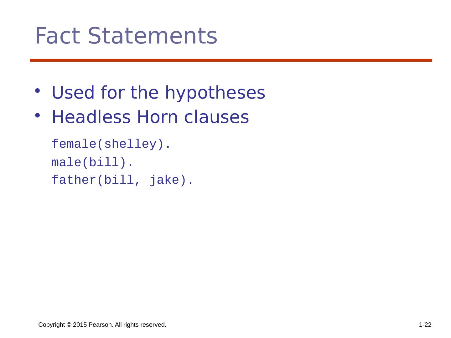 22 .Copyright © 2015 Pearson. All rights reserved. 1- 22 Fact Statements Used for the hypotheses Headless Horn clauses female(shelley). male(bill). father(bill, jake).