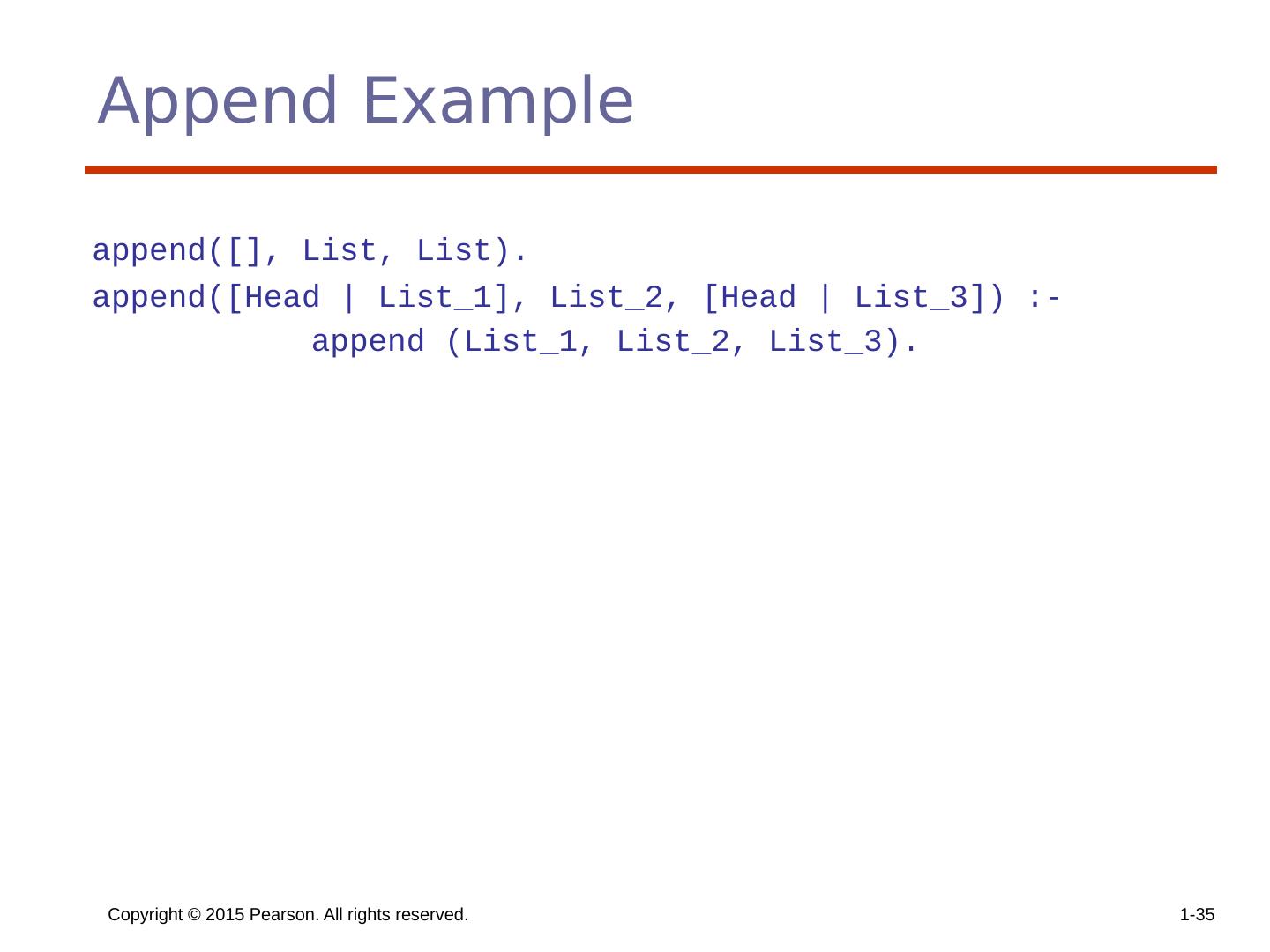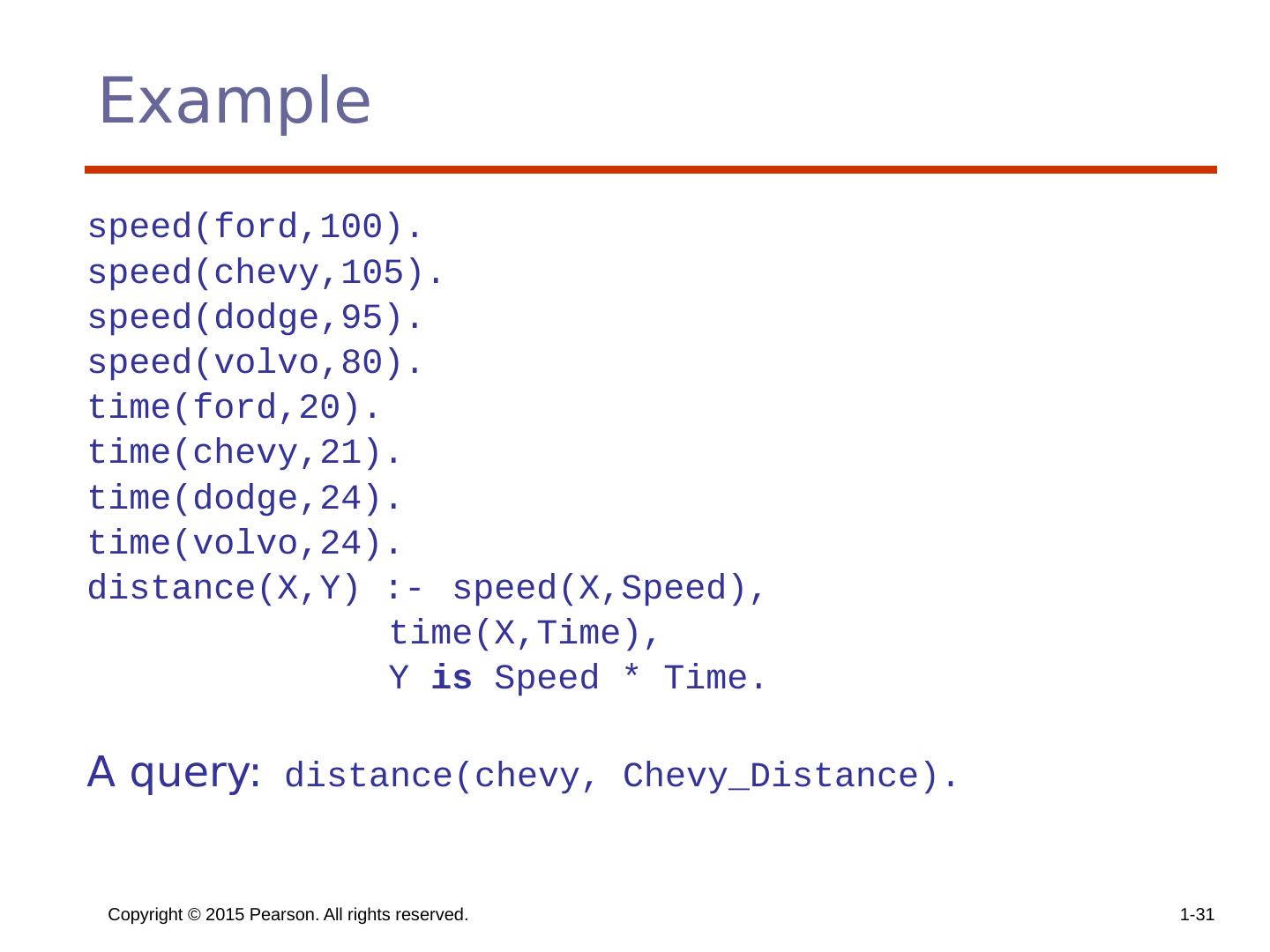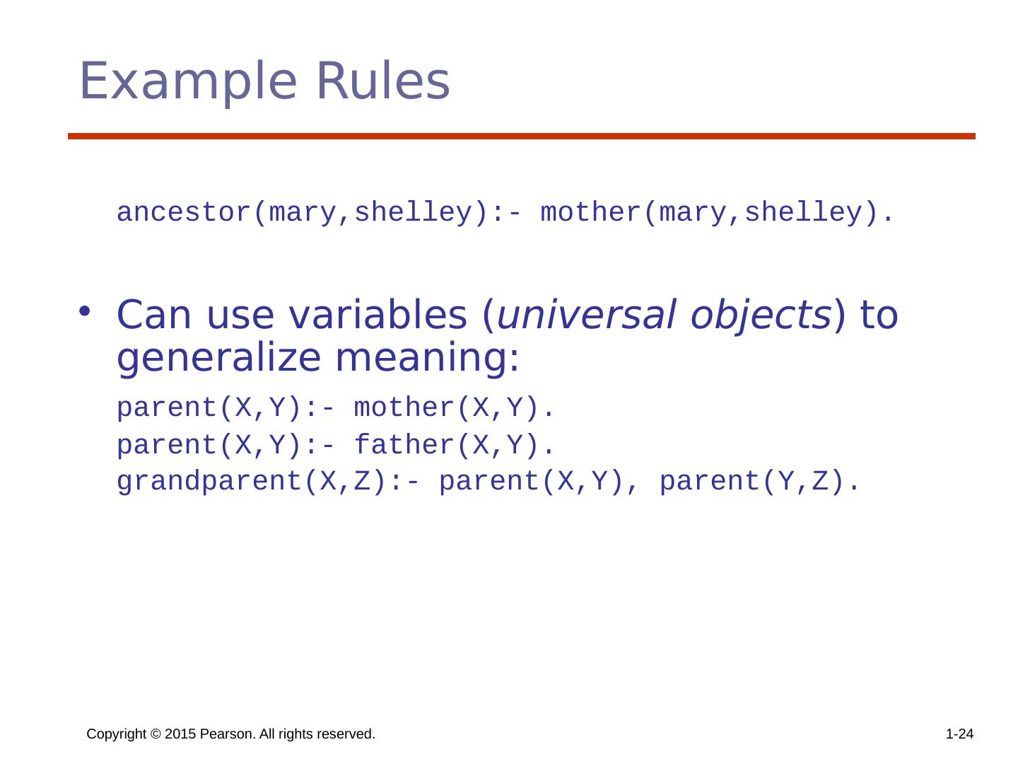 24 .Copyright © 2015 Pearson. All rights reserved. 1- 24 Example Rules ancestor(mary,shelley):- mother(mary,shelley). Can use variables ( universal objects ) to generalize meaning: parent(X,Y):- mother(X,Y). parent(X,Y):- father(X,Y). grandparent(X,Z):- parent(X,Y), parent(Y,Z).