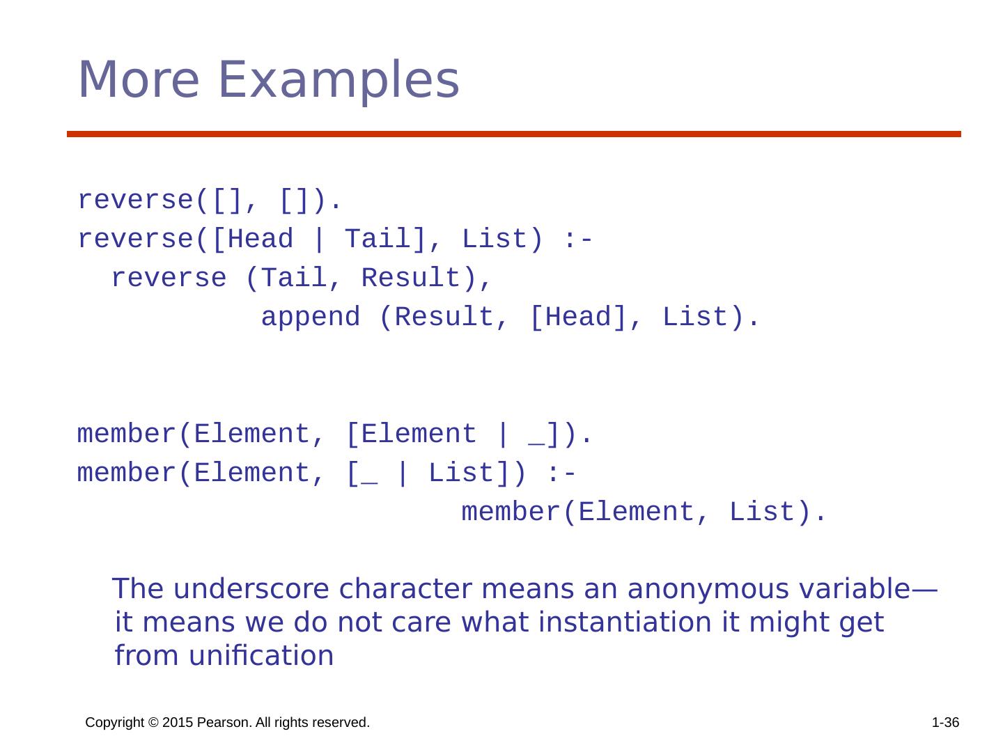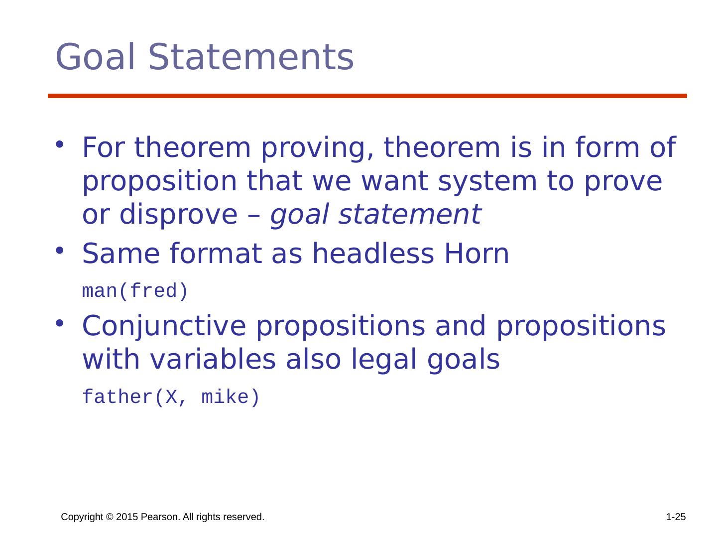 25 .Copyright © 2015 Pearson. All rights reserved. 1- 25 Goal Statements For theorem proving, theorem is in form of proposition that we want system to prove or disprove – goal statement Same format as headless Horn man(fred) Conjunctive propositions and propositions with variables also legal goals father(X, mike)