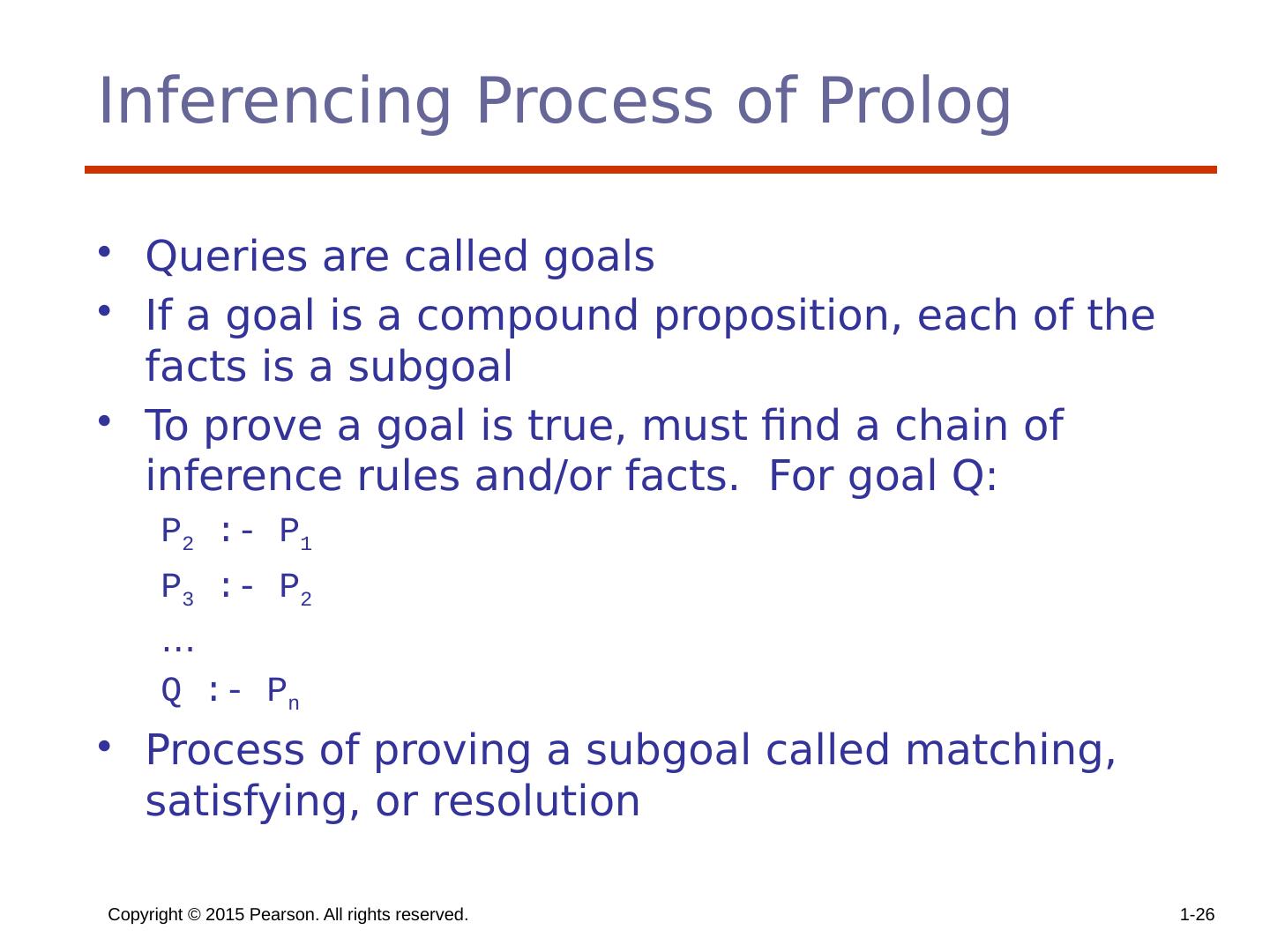26 .Copyright © 2015 Pearson. All rights reserved. 1- 26 Inferencing Process of Prolog Queries are called goals If a goal is a compound proposition, each of the facts is a subgoal To prove a goal is true, must find a chain of inference rules and/or facts. For goal Q: P 2 :- P 1 P 3 :- P 2 … Q :- P n Process of proving a subgoal called matching, satisfying, or resolution