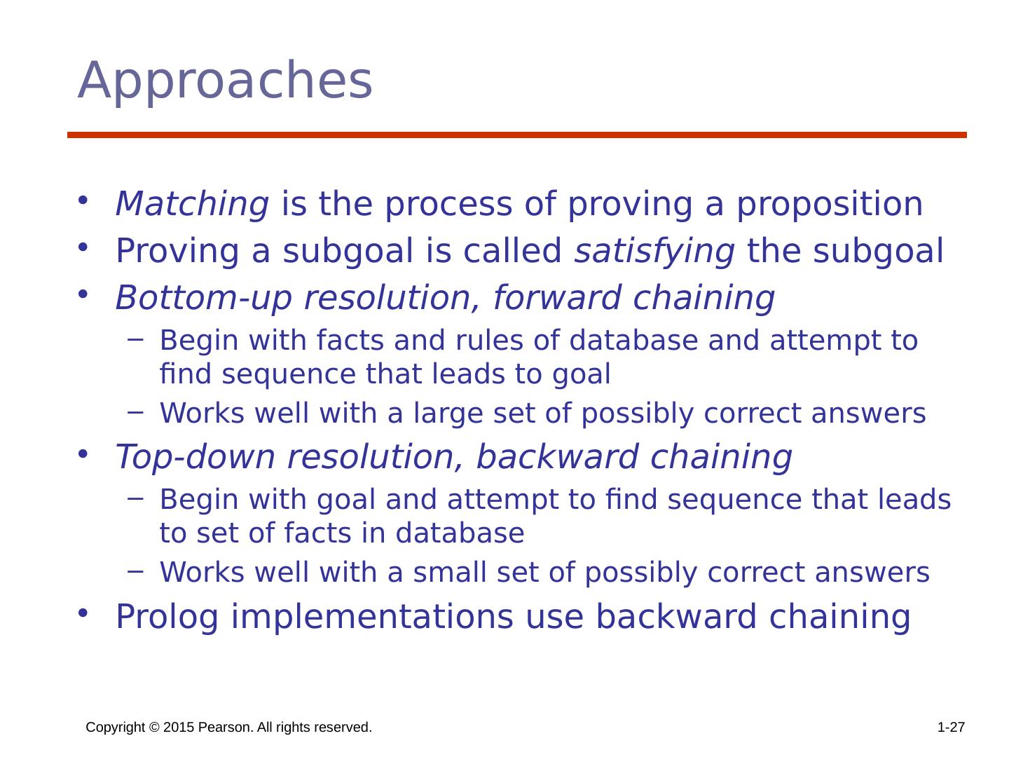 27 .Copyright © 2015 Pearson. All rights reserved. 1- 27 Approaches Matching is the process of proving a proposition Proving a subgoal is called satisfying the subgoal Bottom-up resolution, forward chaining Begin with facts and rules of database and attempt to find sequence that leads to goal Works well with a large set of possibly correct answers Top-down resolution, backward chaining Begin with goal and attempt to find sequence that leads to set of facts in database Works well with a small set of possibly correct answers Prolog implementations use backward chaining