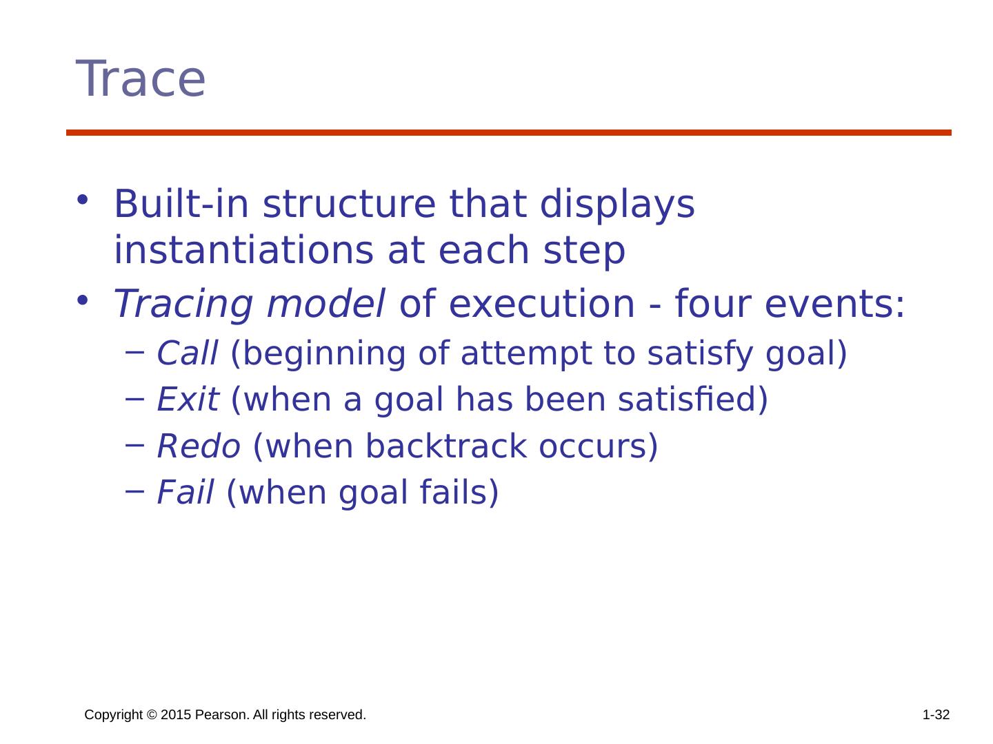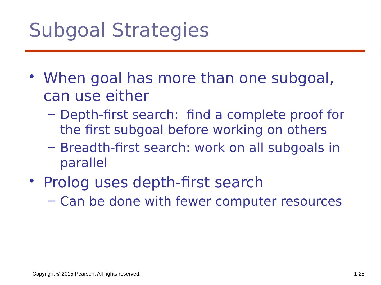 28 .Copyright © 2015 Pearson. All rights reserved. 1- 28 Subgoal Strategies When goal has more than one subgoal, can use either Depth-first search: find a complete proof for the first subgoal before working on others Breadth-first search: work on all subgoals in parallel Prolog uses depth-first search Can be done with fewer computer resources