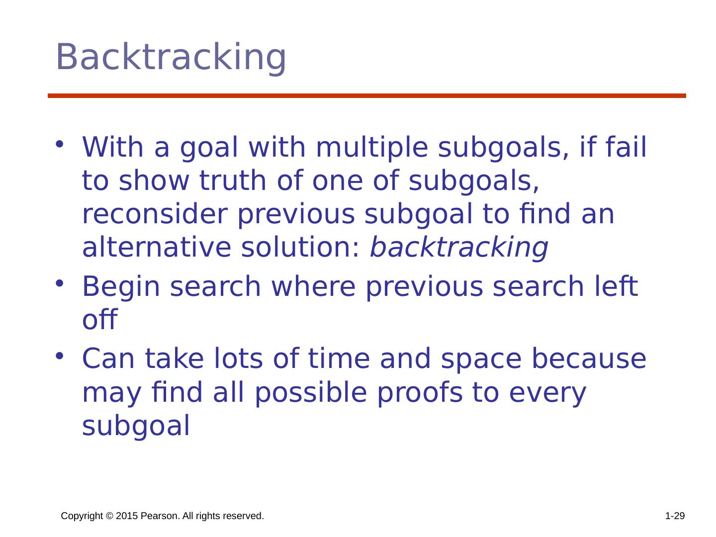 29 .Copyright © 2015 Pearson. All rights reserved. 1- 29 Backtracking With a goal with multiple subgoals, if fail to show truth of one of subgoals, reconsider previous subgoal to find an alternative solution: backtracking Begin search where previous search left off Can take lots of time and space because may find all possible proofs to every subgoal
