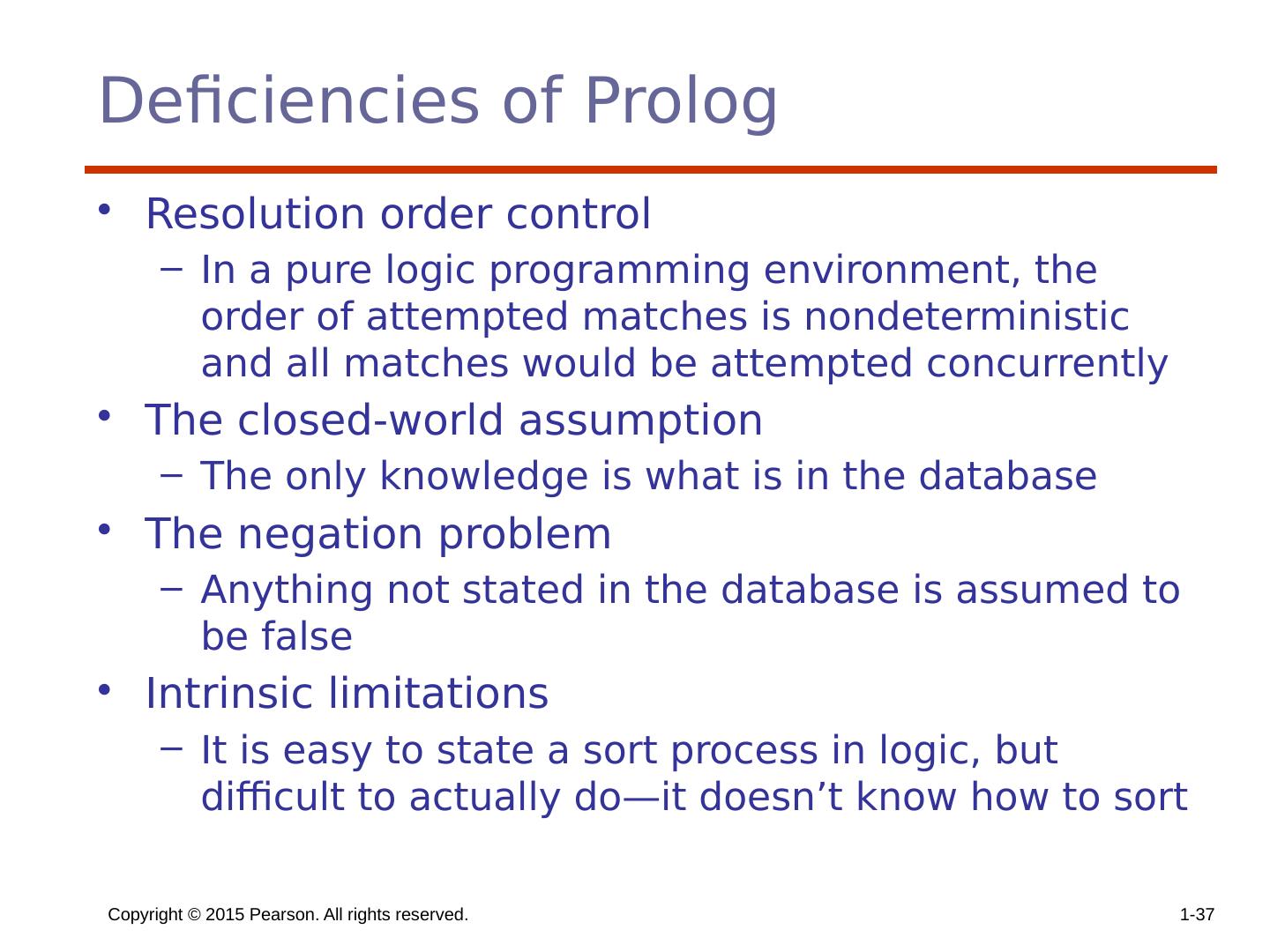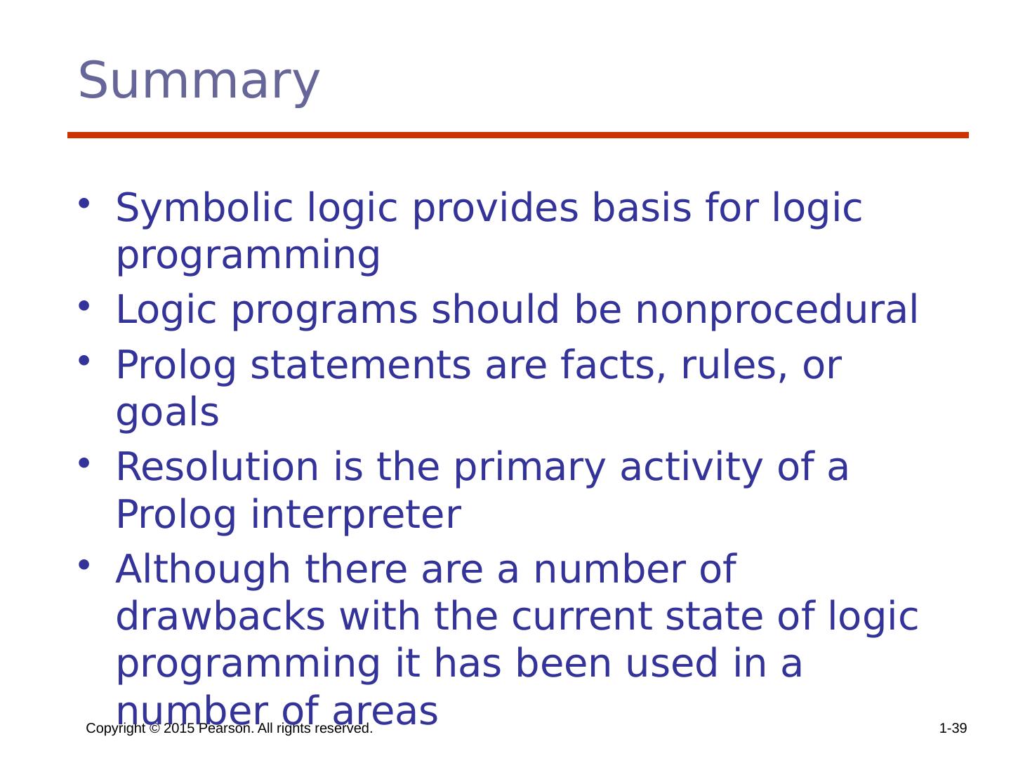 16 .Copyright © 2015 Pearson. All rights reserved. 1- 16 Theorem Proving Basis for logic programming When propositions used for resolution, only restricted form can be used Horn clause - can have only two forms Headed : single atomic proposition on left side Headless : empty left side (used to state facts) Most propositions can be stated as Horn clauses