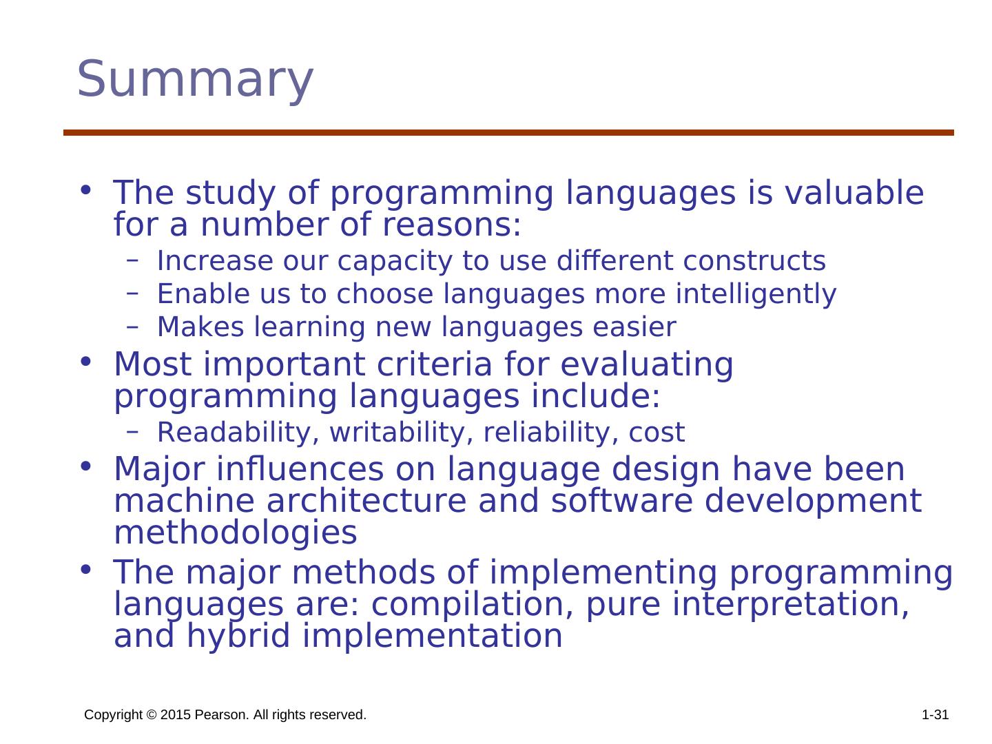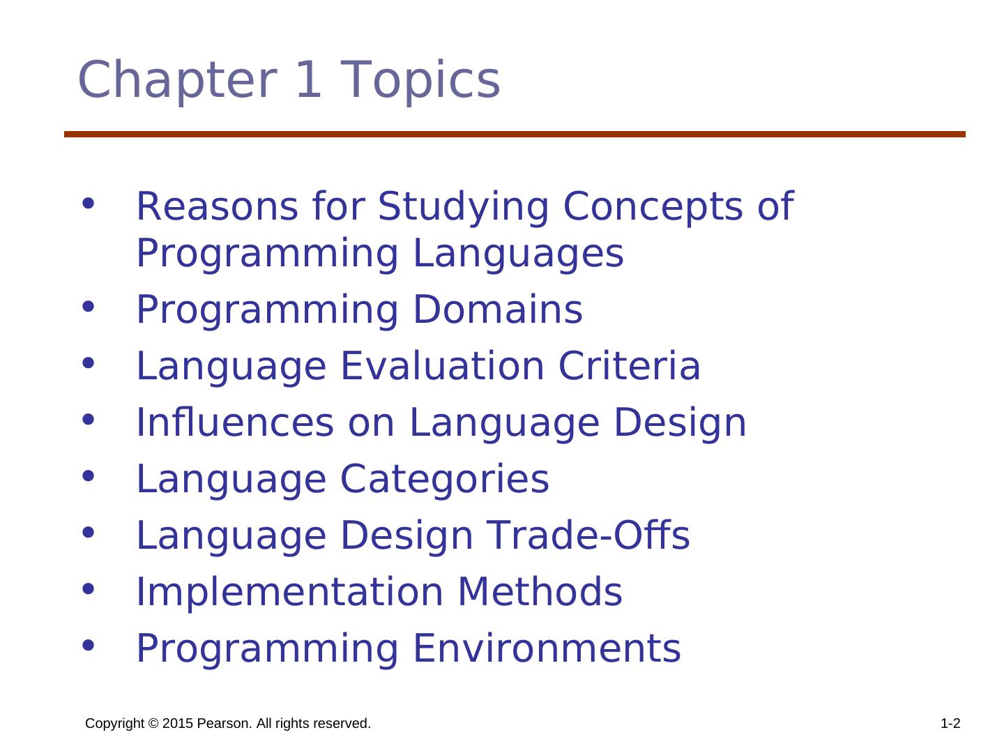 2 .Chapter 1 Topics • Reasons for Studying Concepts of Programming Languages • Programming Domains • Language Evaluation Criteria • Influences on Language Design • Language Categories • Language Design Trade-Offs • Implementation Methods • Programming Environments Copyright © 2015 Pearson. All rights reserved. 1-2