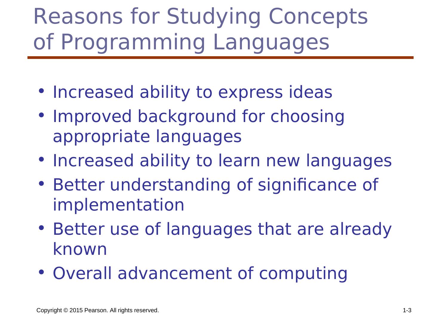 3 .Reasons for Studying Concepts of Programming Languages • Increased ability to express ideas • Improved background for choosing appropriate languages • Increased ability to learn new languages • Better understanding of significance of implementation • Better use of languages that are already known • Overall advancement of computing Copyright © 2015 Pearson. All rights reserved. 1-3