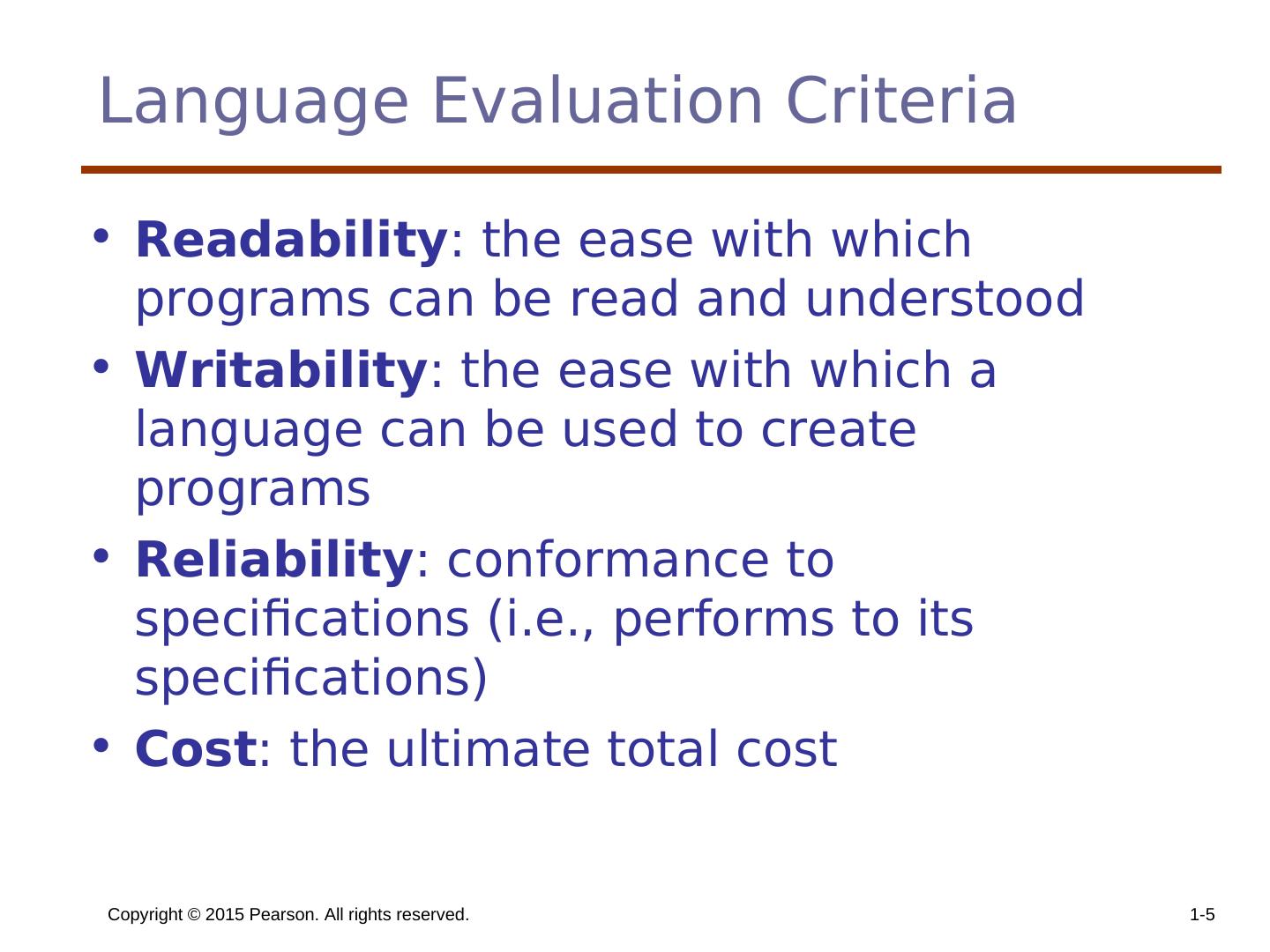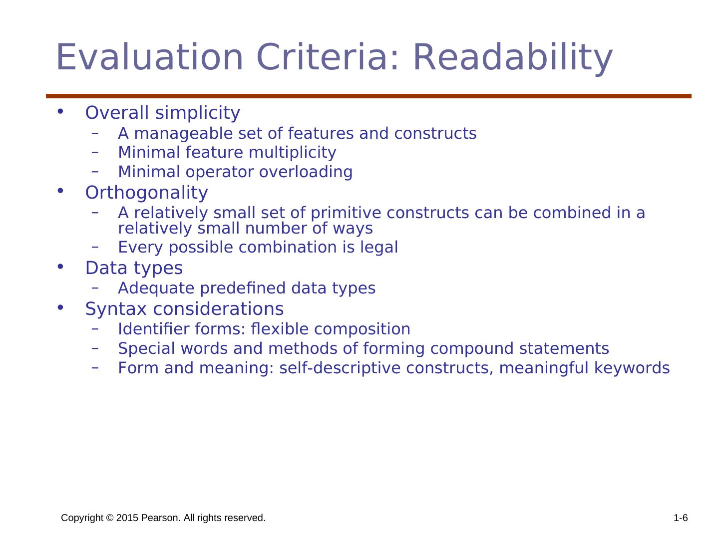 5 .Language Evaluation Criteria • Readability: the ease with which programs can be read and understood • Writability: the ease with which a language can be used to create programs • Reliability: conformance to specifications (i.e., performs to its specifications) • Cost: the ultimate total cost Copyright © 2015 Pearson. All rights reserved. 1-5