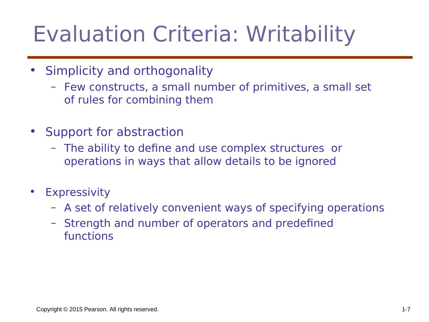 6 .Evaluation Criteria: Readability • Overall simplicity – A manageable set of features and constructs – Minimal feature multiplicity – Minimal operator overloading • Orthogonality – A relatively small set of primitive constructs can be combined in a relatively small number of ways – Every possible combination is legal • Data types – Adequate predefined data types • Syntax considerations – Identifier forms: flexible composition – Special words and methods of forming compound statements – Form and meaning: self-descriptive constructs, meaningful keywords Copyright © 2015 Pearson. All rights reserved. 1-6