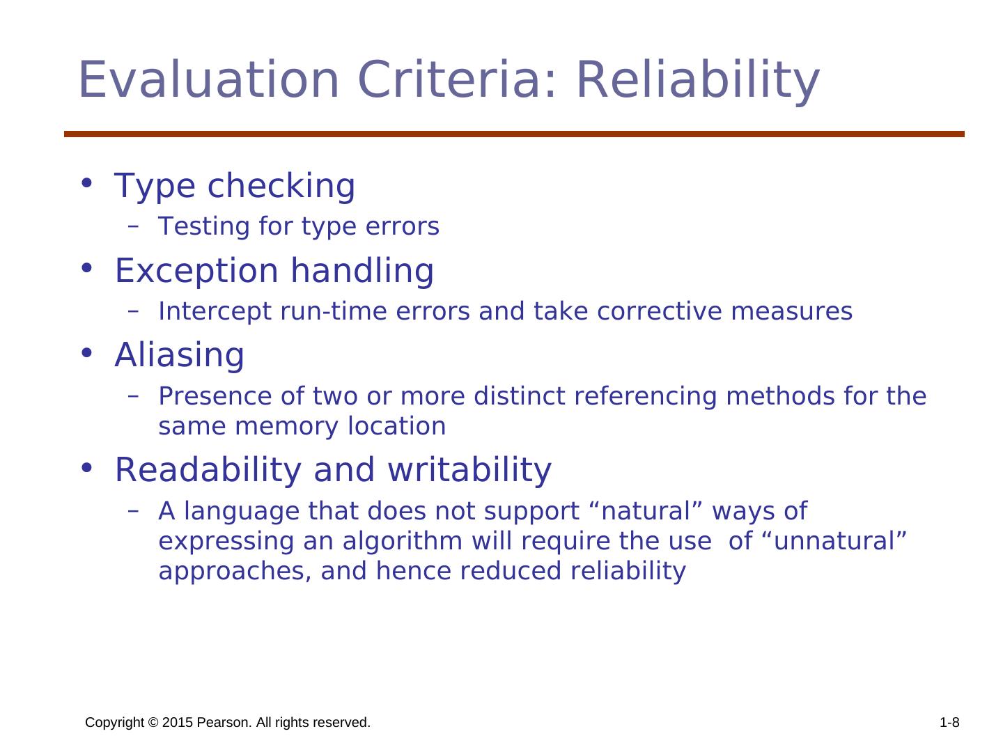 8 .Evaluation Criteria: Reliability • Type checking – Testing for type errors • Exception handling – Intercept run-time errors and take corrective measures • Aliasing – Presence of two or more distinct referencing methods for the same memory location • Readability and writability – A language that does not support “natural” ways of expressing an algorithm will require the use of “unnatural” approaches, and hence reduced reliability Copyright © 2015 Pearson. All rights reserved. 1-8