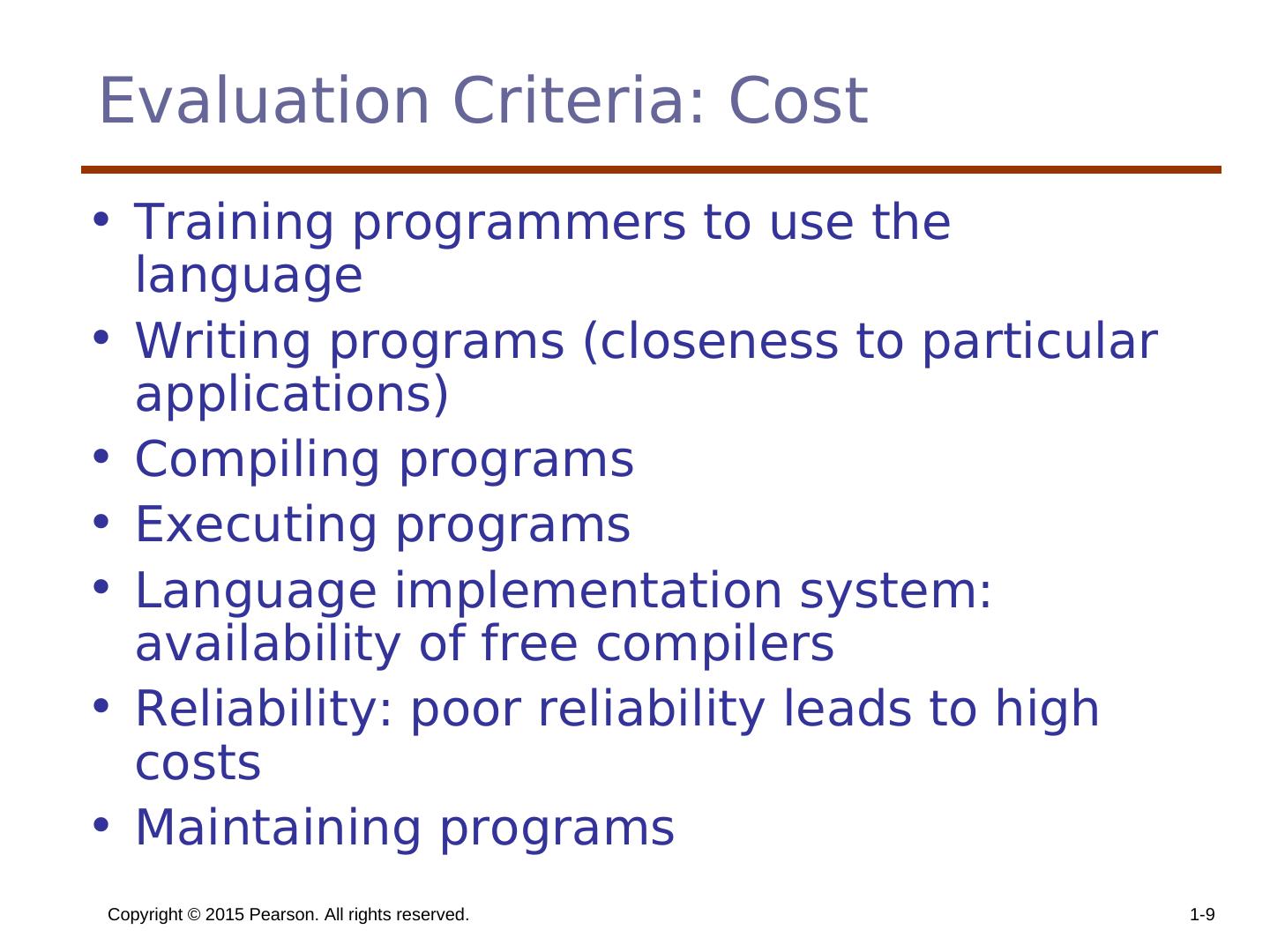 9 .Evaluation Criteria: Cost • Training programmers to use the language • Writing programs (closeness to particular applications) • Compiling programs • Executing programs • Language implementation system: availability of free compilers • Reliability: poor reliability leads to high costs • Maintaining programs Copyright © 2015 Pearson. All rights reserved. 1-9