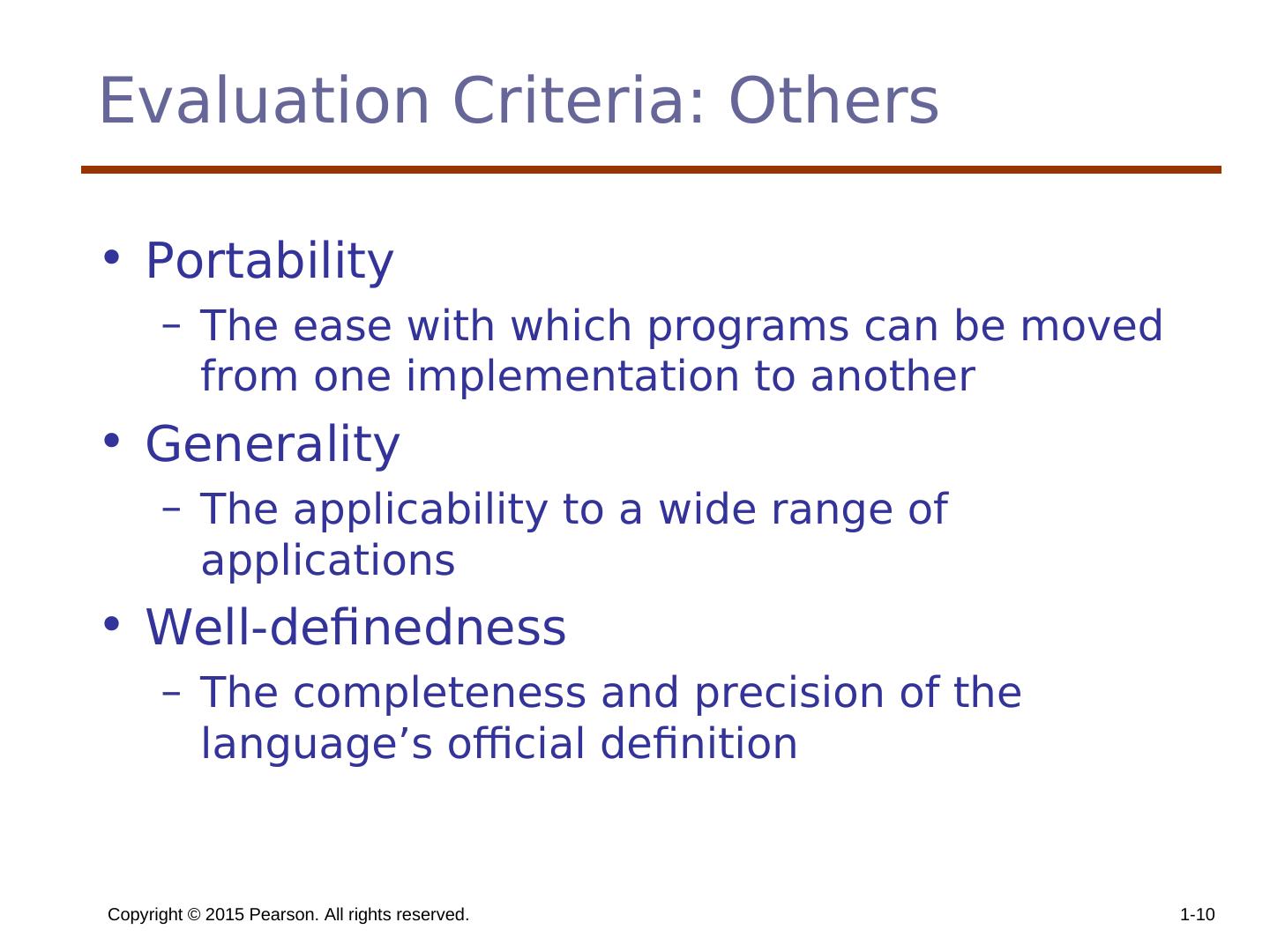 10 .Evaluation Criteria: Others • Portability – The ease with which programs can be moved from one implementation to another • Generality – The applicability to a wide range of applications • Well-definedness – The completeness and precision of the language’s official definition Copyright © 2015 Pearson. All rights reserved. 1-10