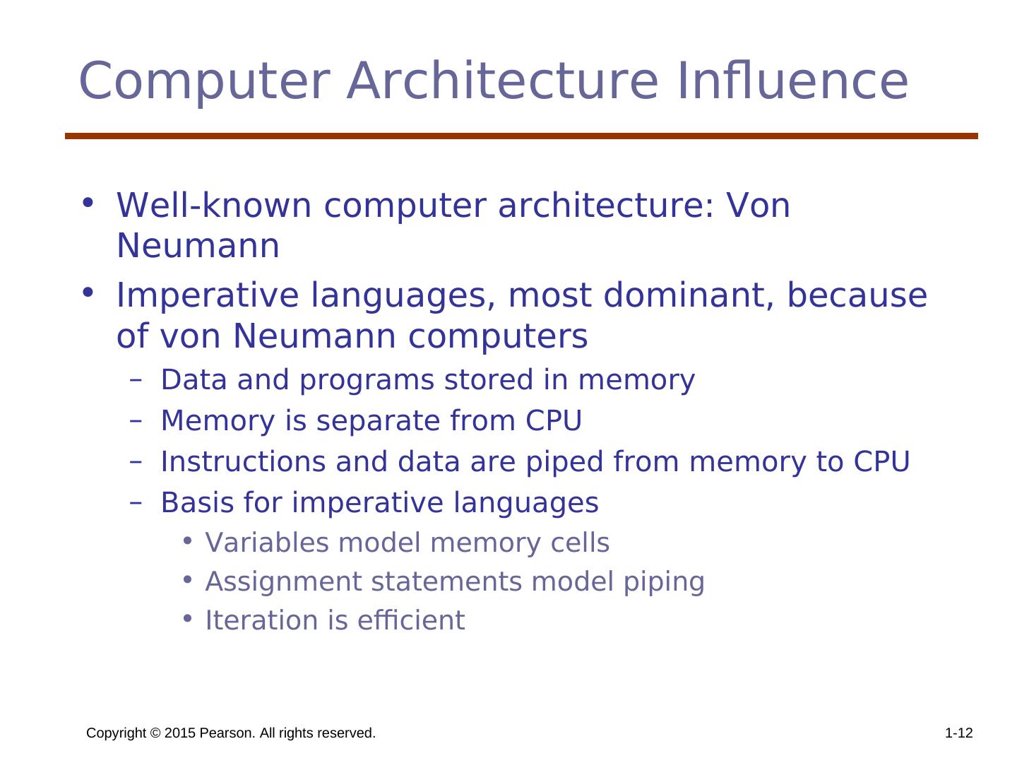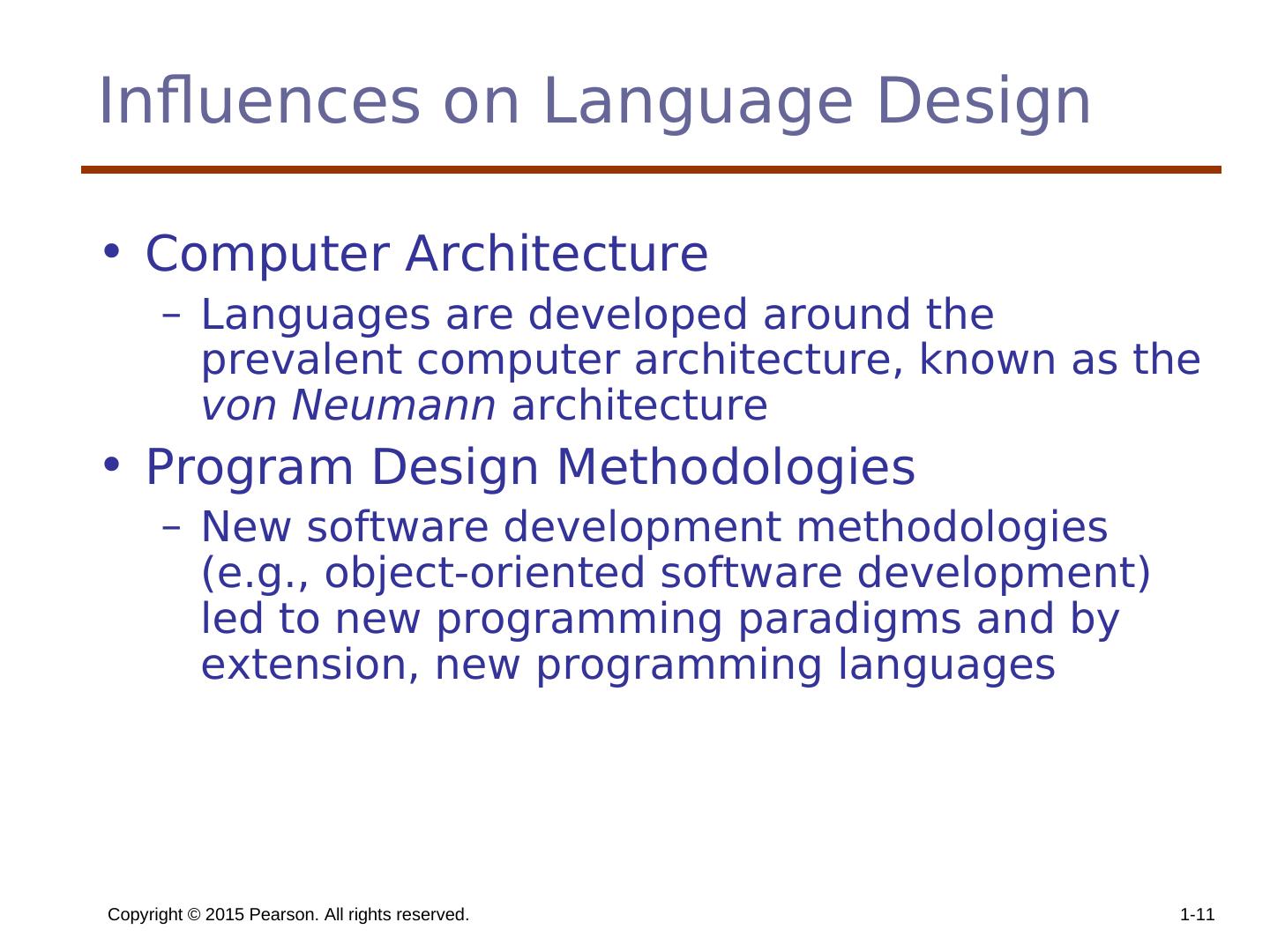 11 .Influences on Language Design • Computer Architecture – Languages are developed around the prevalent computer architecture, known as the von Neumann architecture • Program Design Methodologies – New software development methodologies (e.g., object-oriented software development) led to new programming paradigms and by extension, new programming languages Copyright © 2015 Pearson. All rights reserved. 1-11