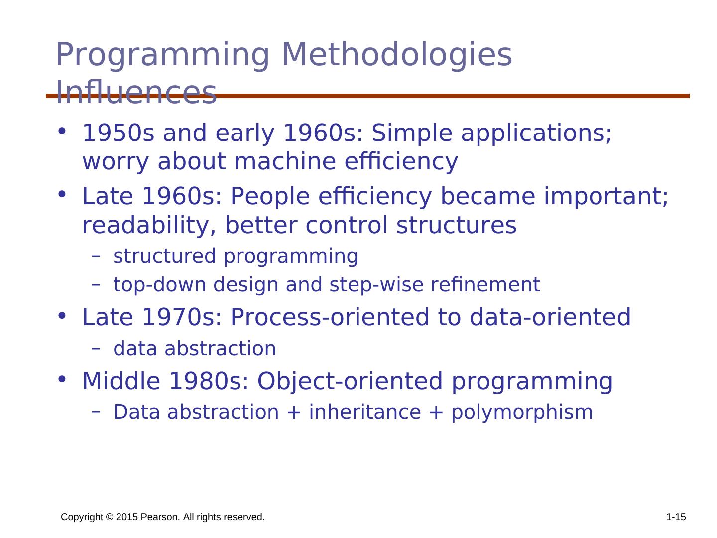 15 .Programming Methodologies Influences • 1950s and early 1960s: Simple applications; worry about machine efficiency • Late 1960s: People efficiency became important; readability, better control structures – structured programming – top-down design and step-wise refinement • Late 1970s: Process-oriented to data-oriented – data abstraction • Middle 1980s: Object-oriented programming – Data abstraction + inheritance + polymorphism Copyright © 2015 Pearson. All rights reserved. 1-15