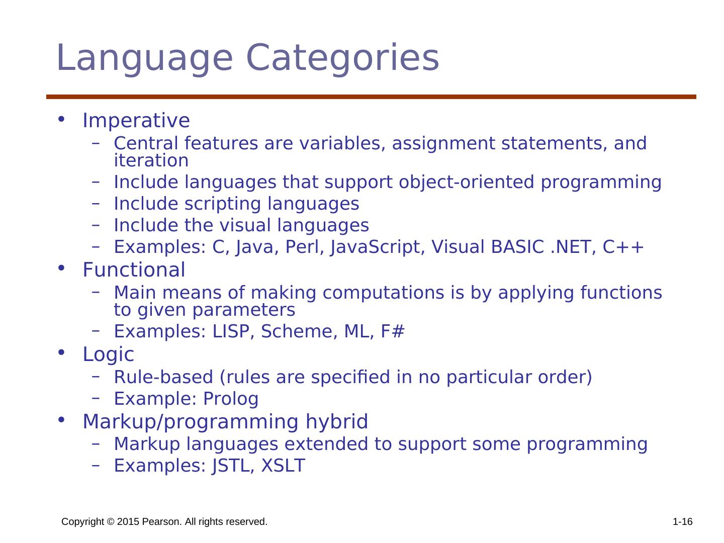 16 .Language Categories • Imperative – Central features are variables, assignment statements, and iteration – Include languages that support object-oriented programming – Include scripting languages – Include the visual languages – Examples: C, Java, Perl, JavaScript, Visual BASIC .NET, C++ • Functional – Main means of making computations is by applying functions to given parameters – Examples: LISP, Scheme, ML, F# • Logic – Rule-based (rules are specified in no particular order) – Example: Prolog • Markup/programming hybrid – Markup languages extended to support some programming – Examples: JSTL, XSLT Copyright © 2015 Pearson. All rights reserved. 1-16