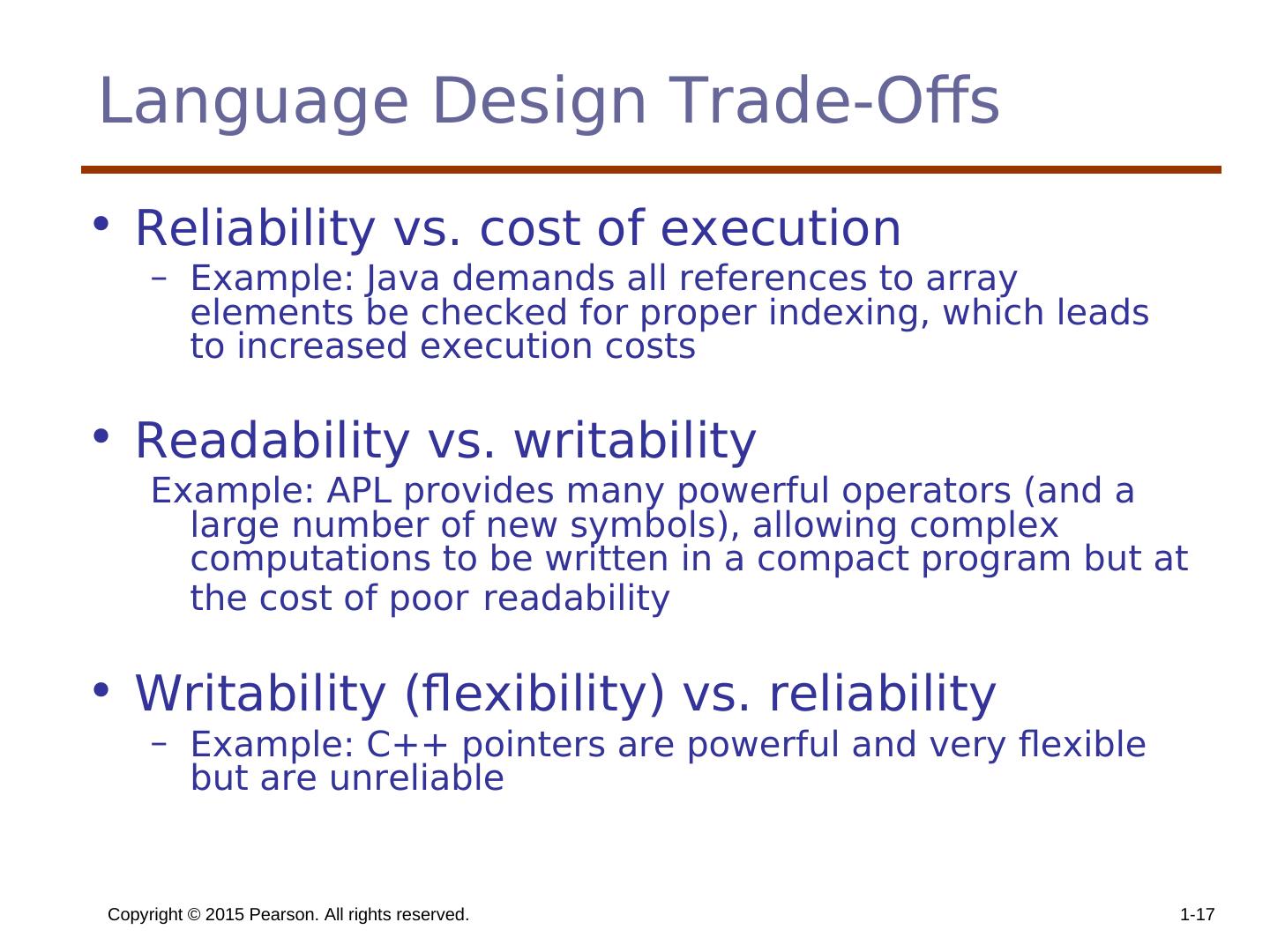 17 .Language Design Trade-Offs • Reliability vs. cost of execution – Example: Java demands all references to array elements be checked for proper indexing, which leads to increased execution costs • Readability vs. writability Example: APL provides many powerful operators (and a large number of new symbols), allowing complex computations to be written in a compact program but at the cost of poor readability • Writability (flexibility) vs. reliability – Example: C++ pointers are powerful and very flexible but are unreliable Copyright © 2015 Pearson. All rights reserved. 1-17