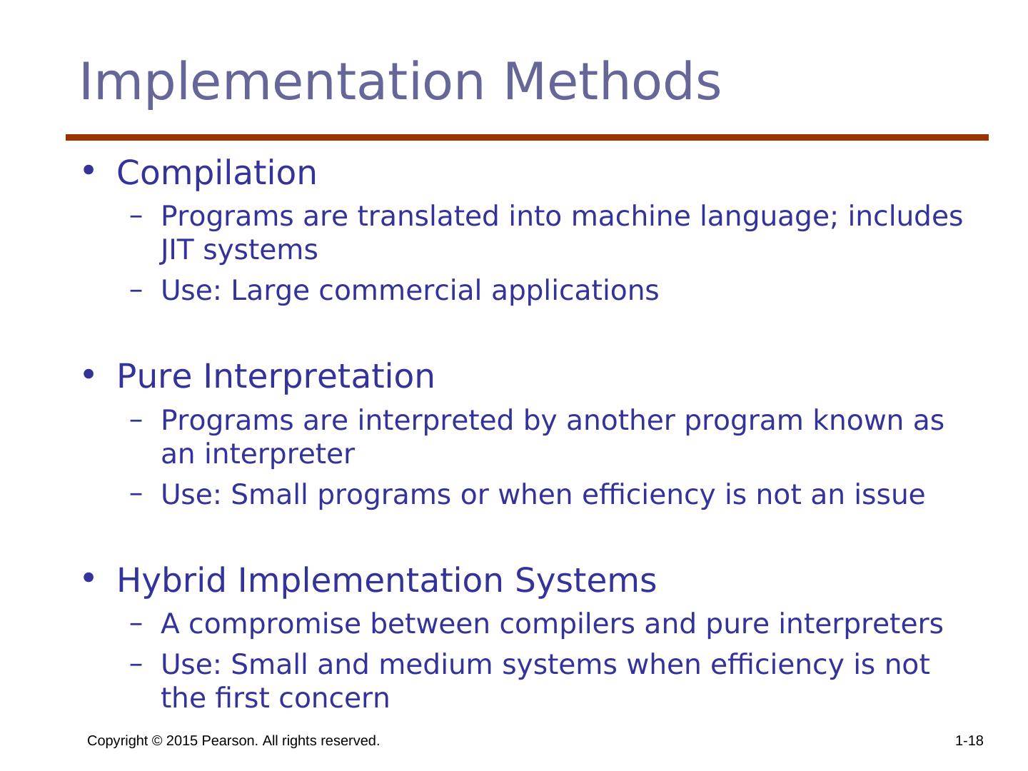 18 .Implementation Methods • Compilation – Programs are translated into machine language; includes JIT systems – Use: Large commercial applications • Pure Interpretation – Programs are interpreted by another program known as an interpreter – Use: Small programs or when efficiency is not an issue • Hybrid Implementation Systems – A compromise between compilers and pure interpreters – Use: Small and medium systems when efficiency is not the first concern Copyright © 2015 Pearson. All rights reserved. 1-18