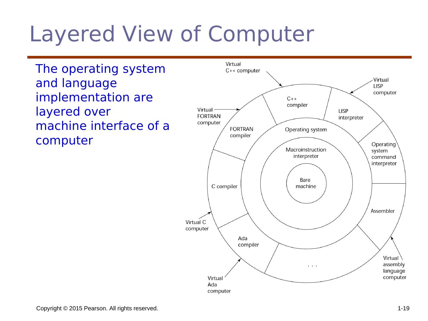 19 .Layered View of Computer The operating system and language implementation are layered over machine interface of a computer Copyright © 2015 Pearson. All rights reserved. 1-19