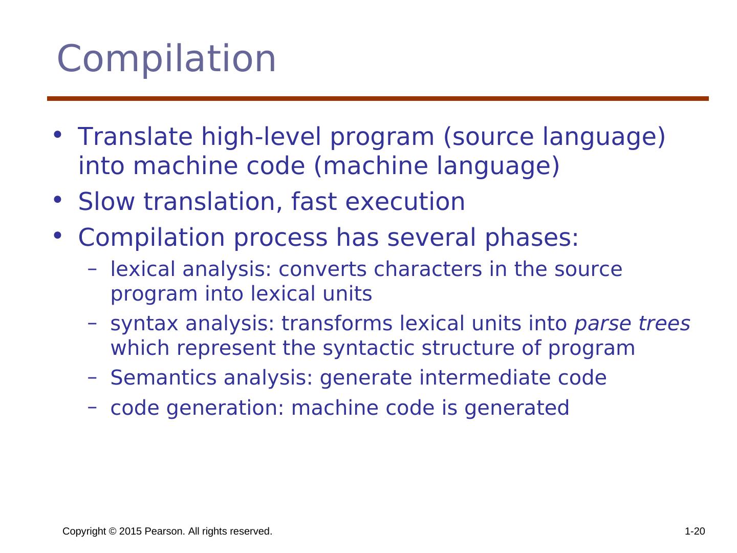 20 .Compilation • Translate high-level program (source language) into machine code (machine language) • Slow translation, fast execution • Compilation process has several phases: – lexical analysis: converts characters in the source program into lexical units – syntax analysis: transforms lexical units into parse trees which represent the syntactic structure of program – Semantics analysis: generate intermediate code – code generation: machine code is generated Copyright © 2015 Pearson. All rights reserved. 1-20