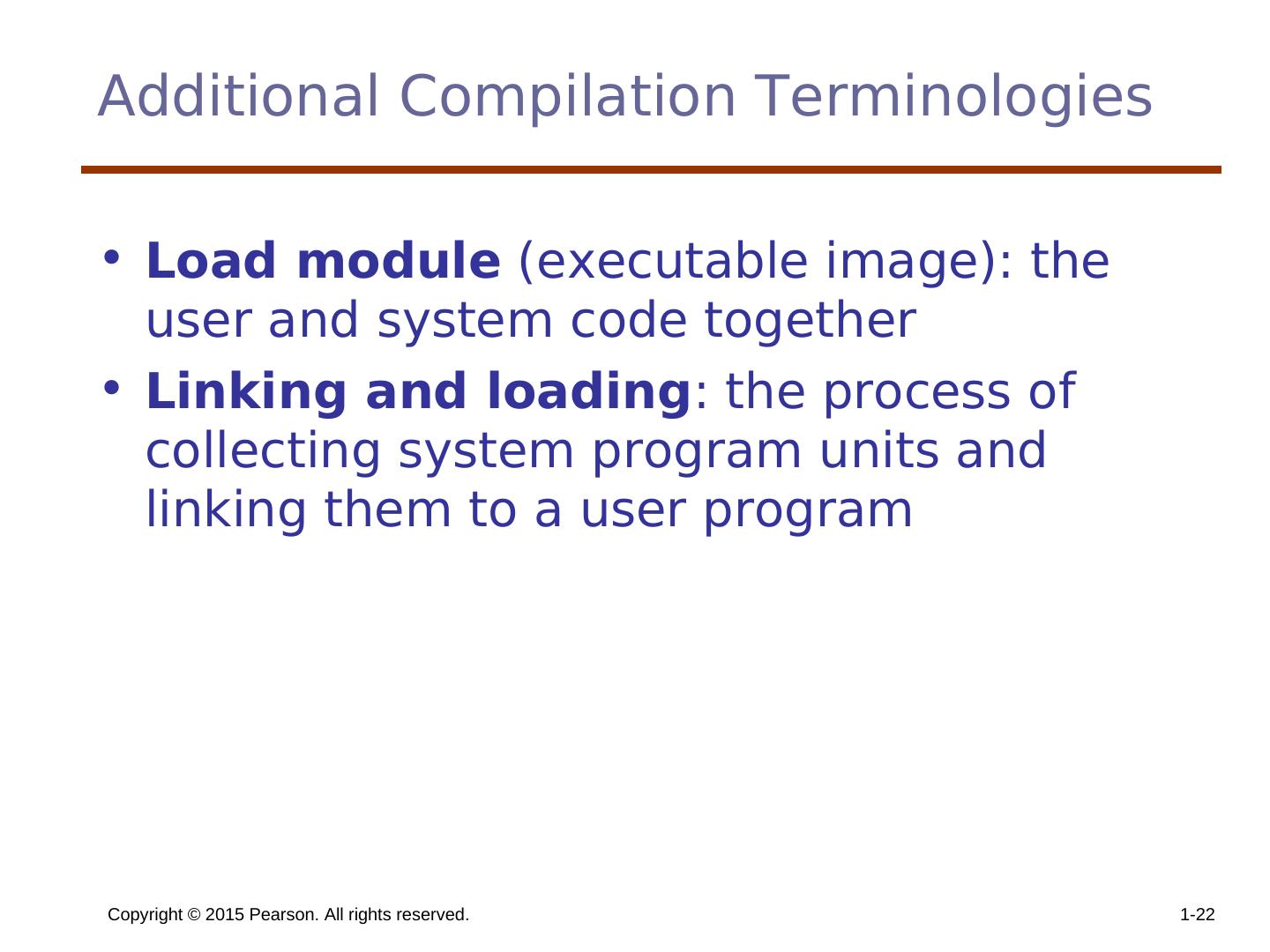 22 .Additional Compilation Terminologies • Load module (executable image): the user and system code together • Linking and loading: the process of collecting system program units and linking them to a user program Copyright © 2015 Pearson. All rights reserved. 1-22
