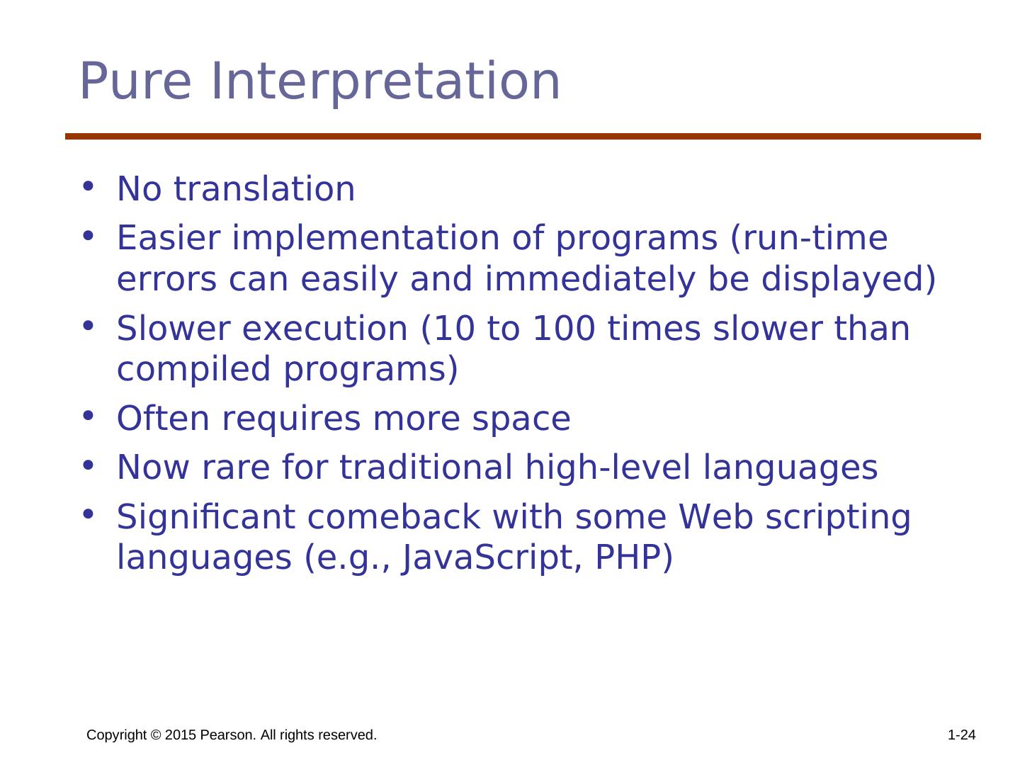 24 .Pure Interpretation • No translation • Easier implementation of programs (run-time errors can easily and immediately be displayed) • Slower execution (10 to 100 times slower than compiled programs) • Often requires more space • Now rare for traditional high-level languages • Significant comeback with some Web scripting languages (e.g., JavaScript, PHP) Copyright © 2015 Pearson. All rights reserved. 1-24