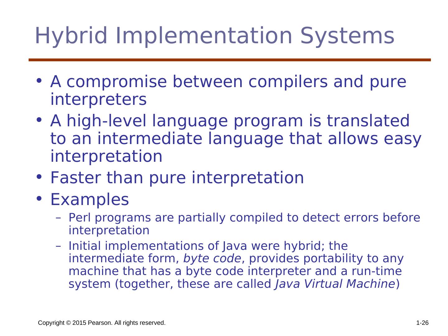 26 .Hybrid Implementation Systems • A compromise between compilers and pure interpreters • A high-level language program is translated to an intermediate language that allows easy interpretation • Faster than pure interpretation • Examples – Perl programs are partially compiled to detect errors before interpretation – Initial implementations of Java were hybrid; the intermediate form, byte code, provides portability to any machine that has a byte code interpreter and a run-time system (together, these are called Java Virtual Machine) Copyright © 2015 Pearson. All rights reserved. 1-26