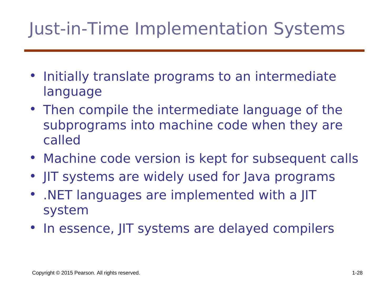 28 .Just-in-Time Implementation Systems • Initially translate programs to an intermediate language • Then compile the intermediate language of the subprograms into machine code when they are called • Machine code version is kept for subsequent calls • JIT systems are widely used for Java programs • .NET languages are implemented with a JIT system • In essence, JIT systems are delayed compilers Copyright © 2015 Pearson. All rights reserved. 1-28