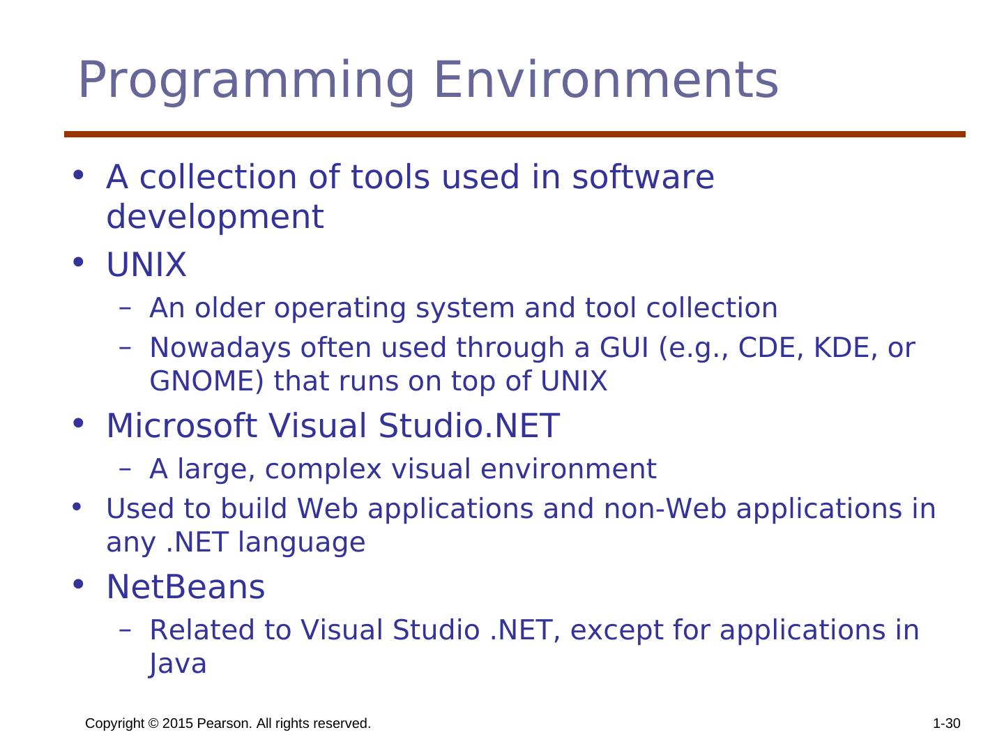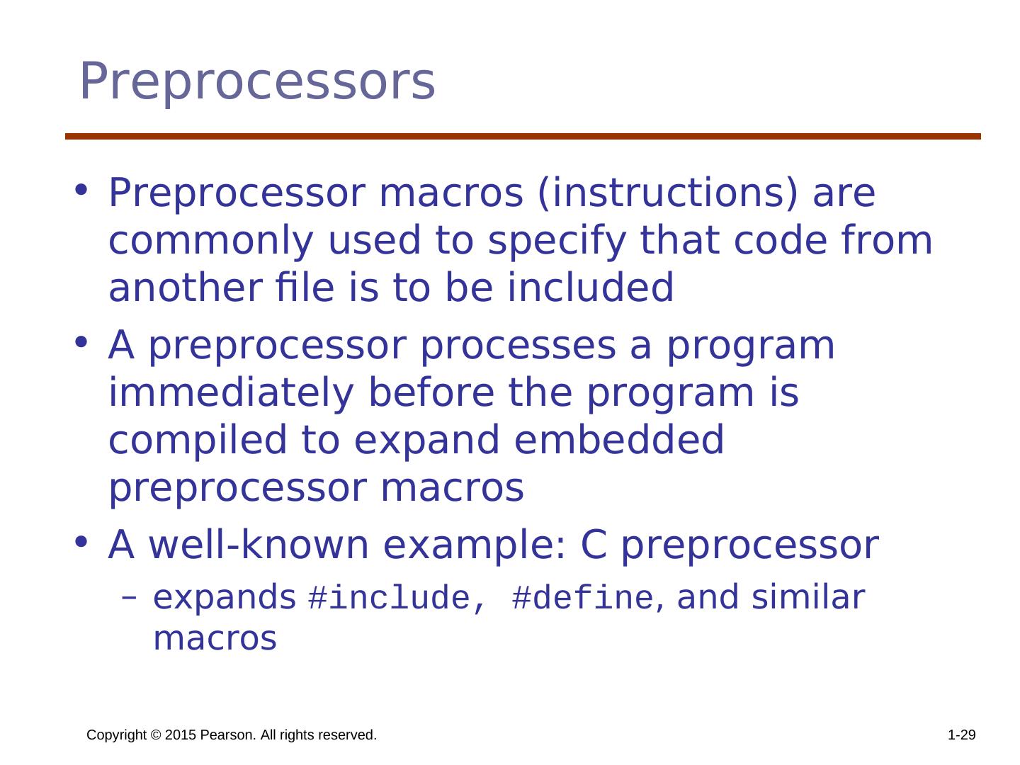 29 .Preprocessors • Preprocessor macros (instructions) are commonly used to specify that code from another file is to be included • A preprocessor processes a program immediately before the program is compiled to expand embedded preprocessor macros • A well-known example: C preprocessor – expands #include, #define, and similar macros Copyright © 2015 Pearson. All rights reserved. 1-29