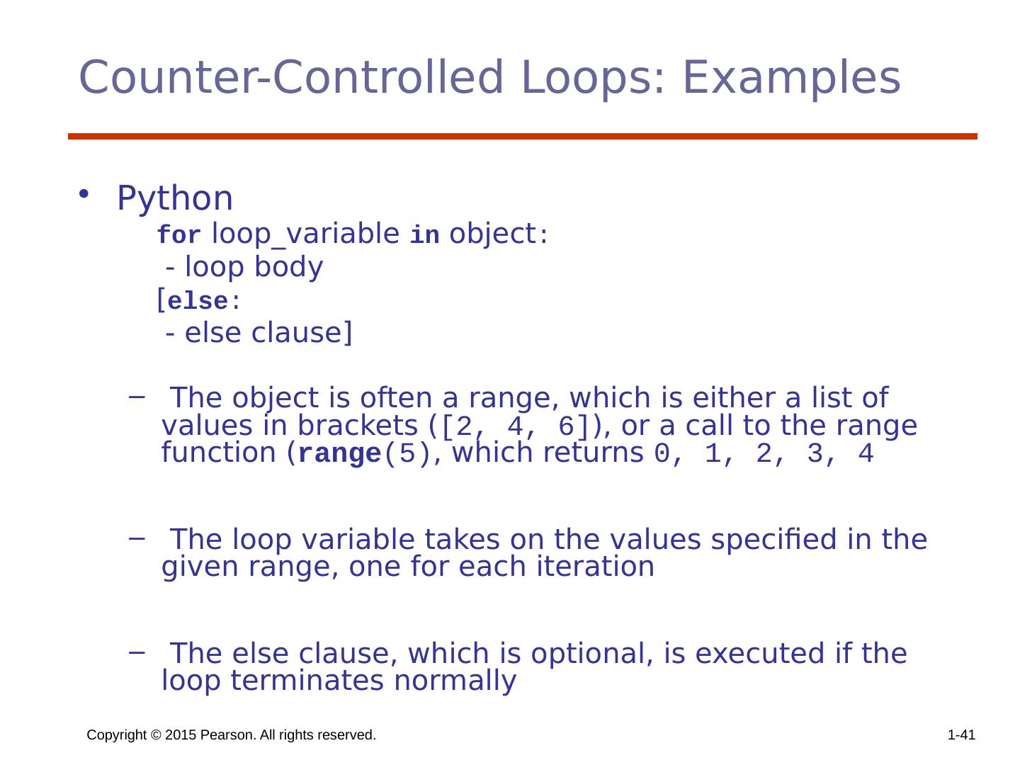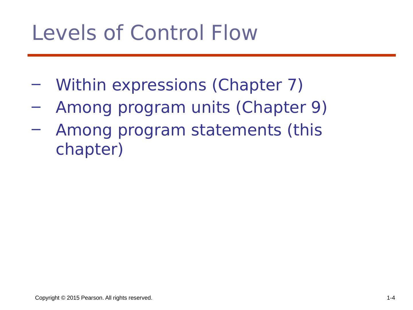 4 .Copyright © 2015 Pearson. All rights reserved. 1- 4 Levels of Control Flow Within expressions (Chapter 7) Among program units (Chapter 9) Among program statements (this chapter)