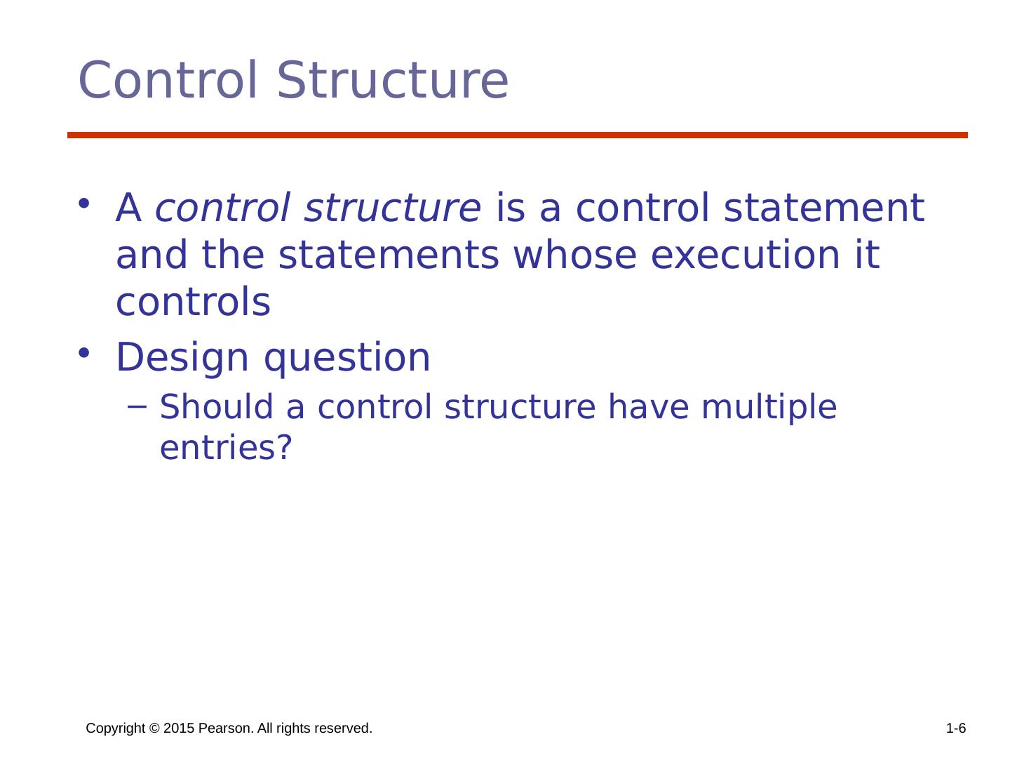 6 .Copyright © 2015 Pearson. All rights reserved. 1- 6 Control Structure A control structure is a control statement and the statements whose execution it controls Design question Should a control structure have multiple entries?