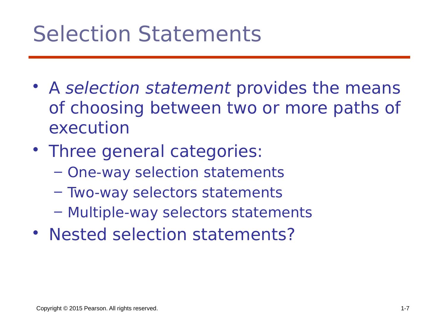 7 .Copyright © 2015 Pearson. All rights reserved. 1- 7 Selection Statements A selection statement provides the means of choosing between two or more paths of execution Three general categories: One-way selection statements Two-way selectors statements Multiple-way selectors statements Nested selection statements?