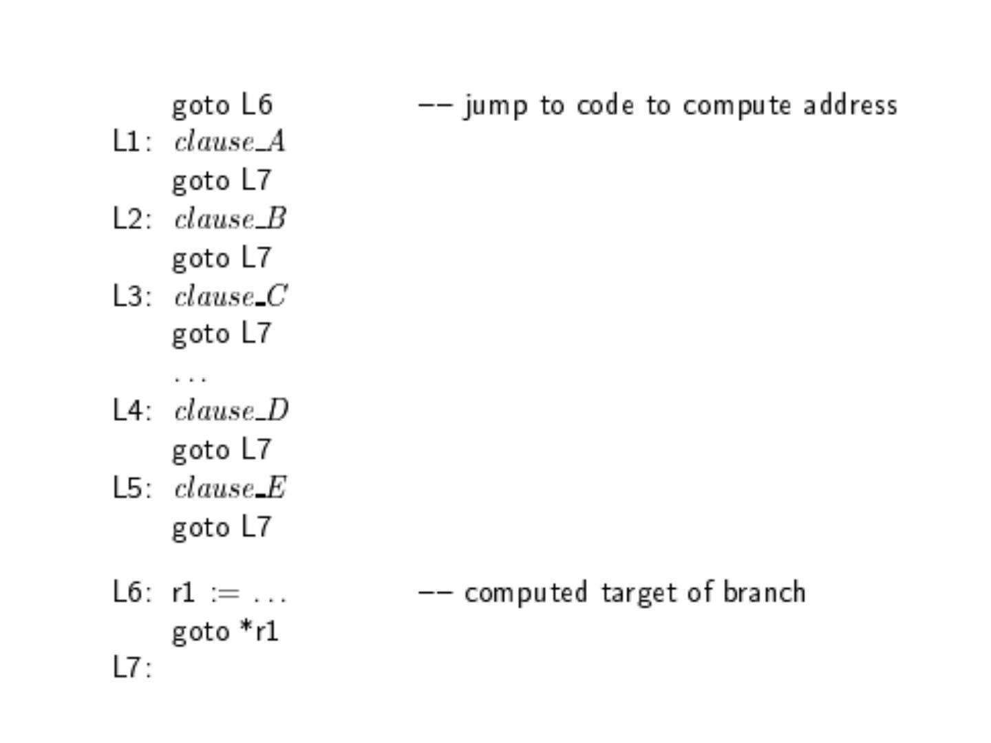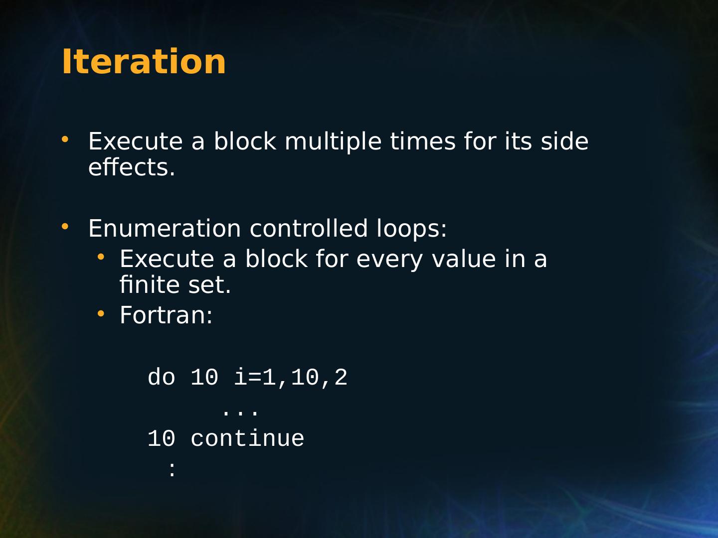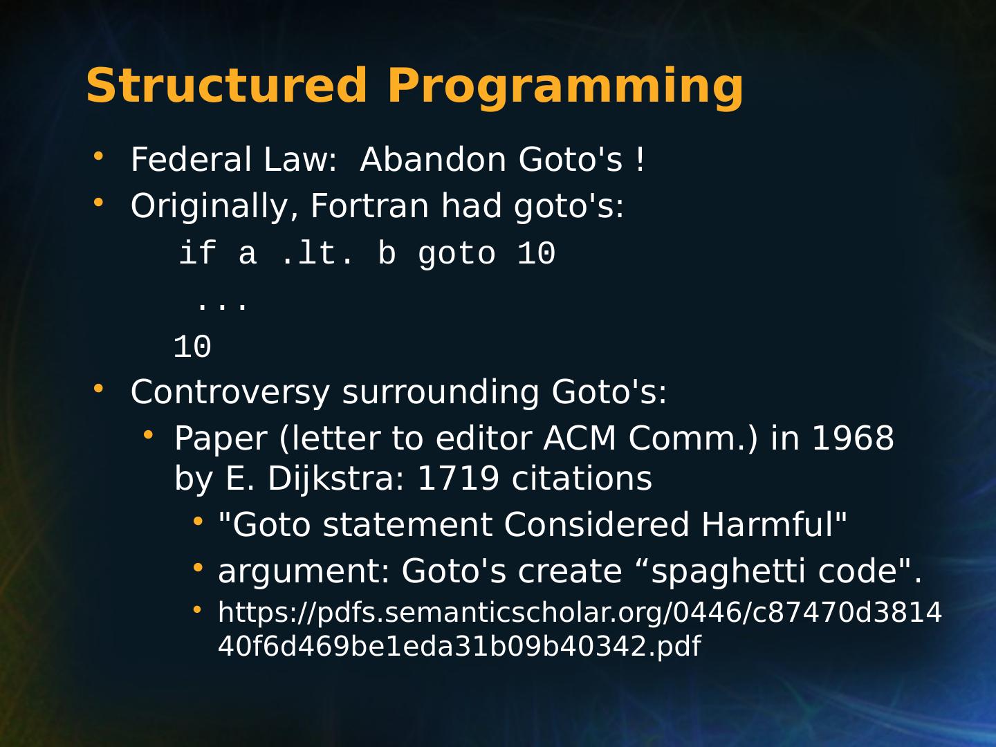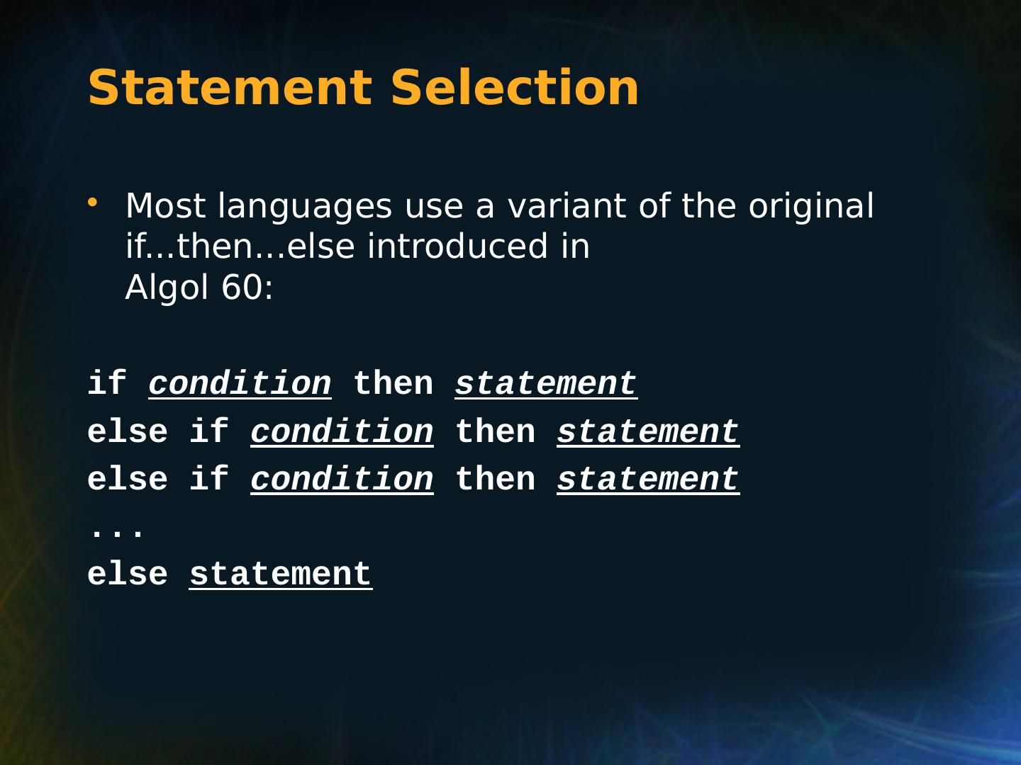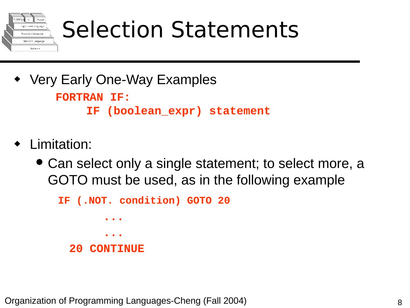 8 .Selection Statements Very Early One-Way Examples FORTRAN IF: IF ( boolean_expr ) statement Limitation: C an select only a single statement; to select more, a GOTO must be used, as in the following example IF (.NOT. condition) GOTO 20 ... ... 20 CONTINUE
