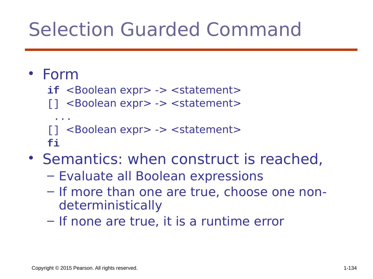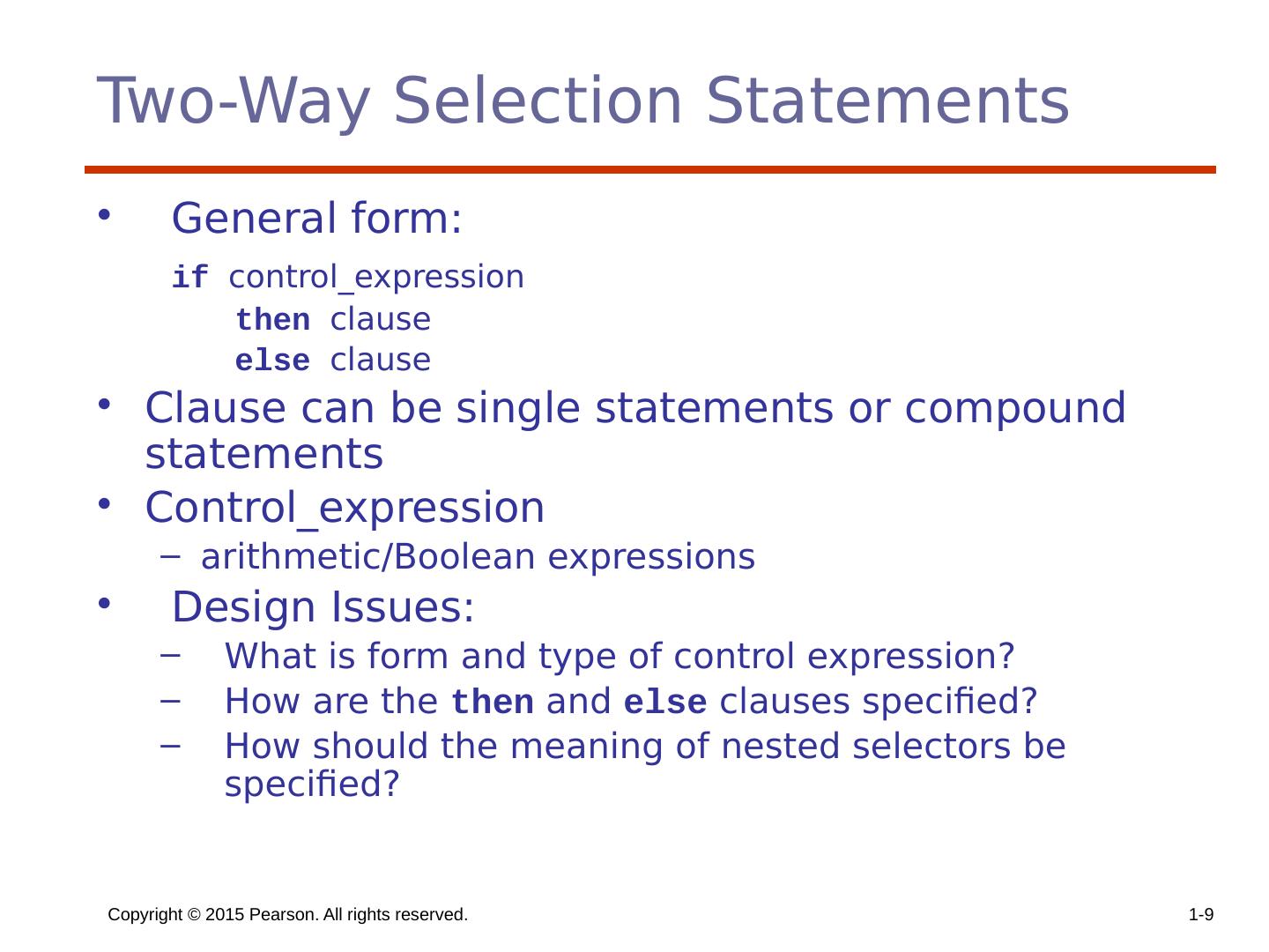 9 .Copyright © 2015 Pearson. All rights reserved. 1- 9 Two-Way Selection Statements General form: if control_expression then clause else clause Clause can be single statements or compound statements Control_expression arithmetic/Boolean expressions Design Issues: What is form and type of control expression? How are the then and else clauses specified? How should the meaning of nested selectors be specified?
