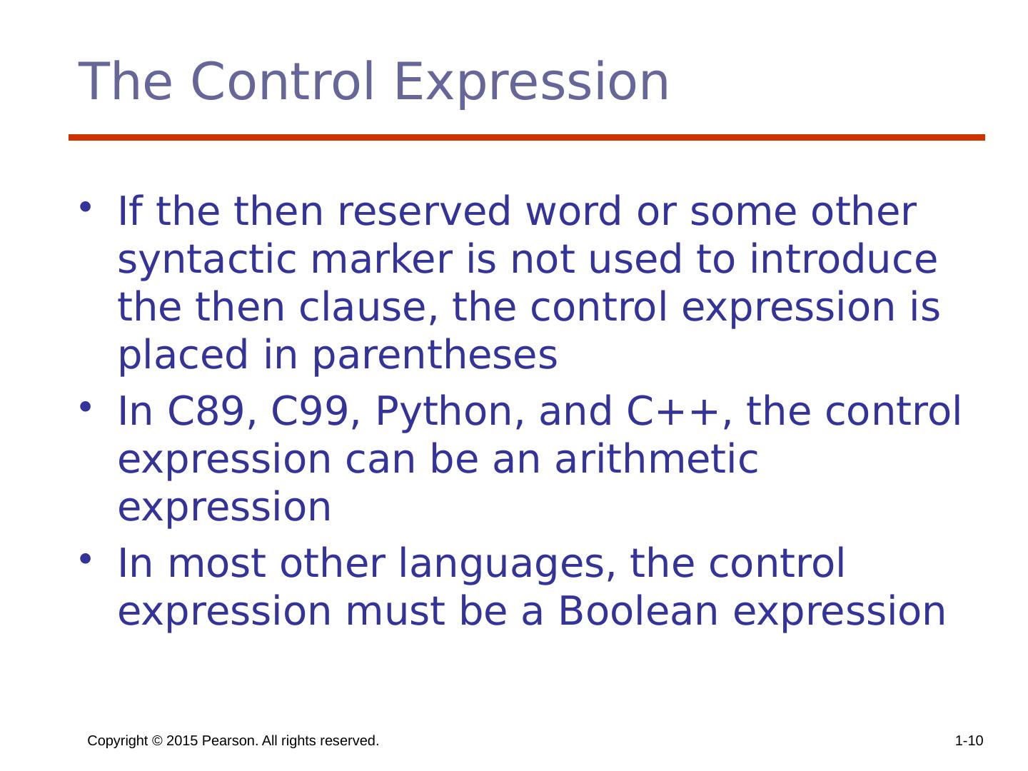 10 .Copyright © 2015 Pearson. All rights reserved. 1- 10 The Control Expression If the then reserved word or some other syntactic marker is not used to introduce the then clause, the control expression is placed in parentheses In C89, C99, Python, and C++, the control expression can be an arithmetic expression In most other languages, the control expression must be a Boolean expression