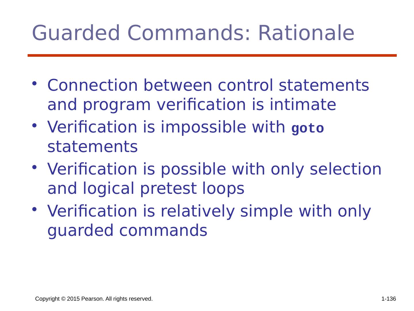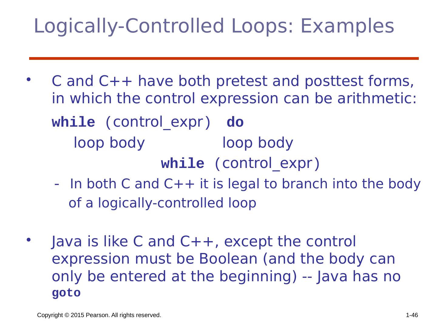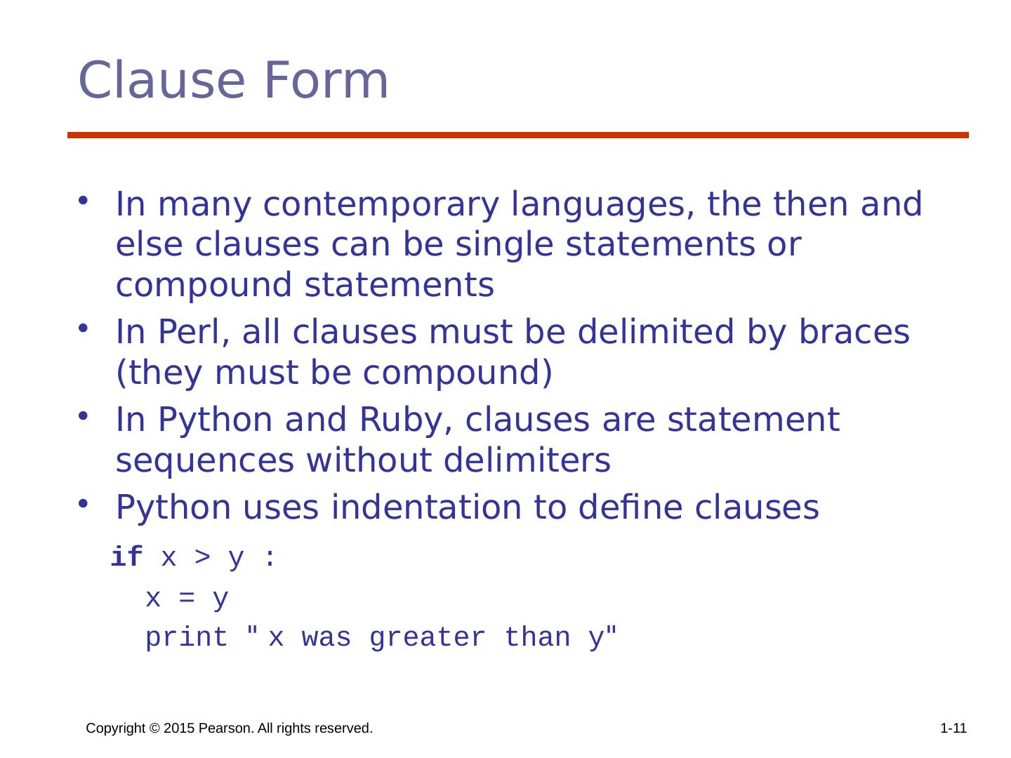 12 .Copyright © 2015 Pearson. All rights reserved. 1- 11 Clause Form In many contemporary languages, the then and else clauses can be single statements or compound statements In Perl, all clauses must be delimited by braces (they must be compound) In Python and Ruby, clauses are statement sequences without delimiters Python uses indentation to define clauses if x > y : x = y print " x was greater than y "