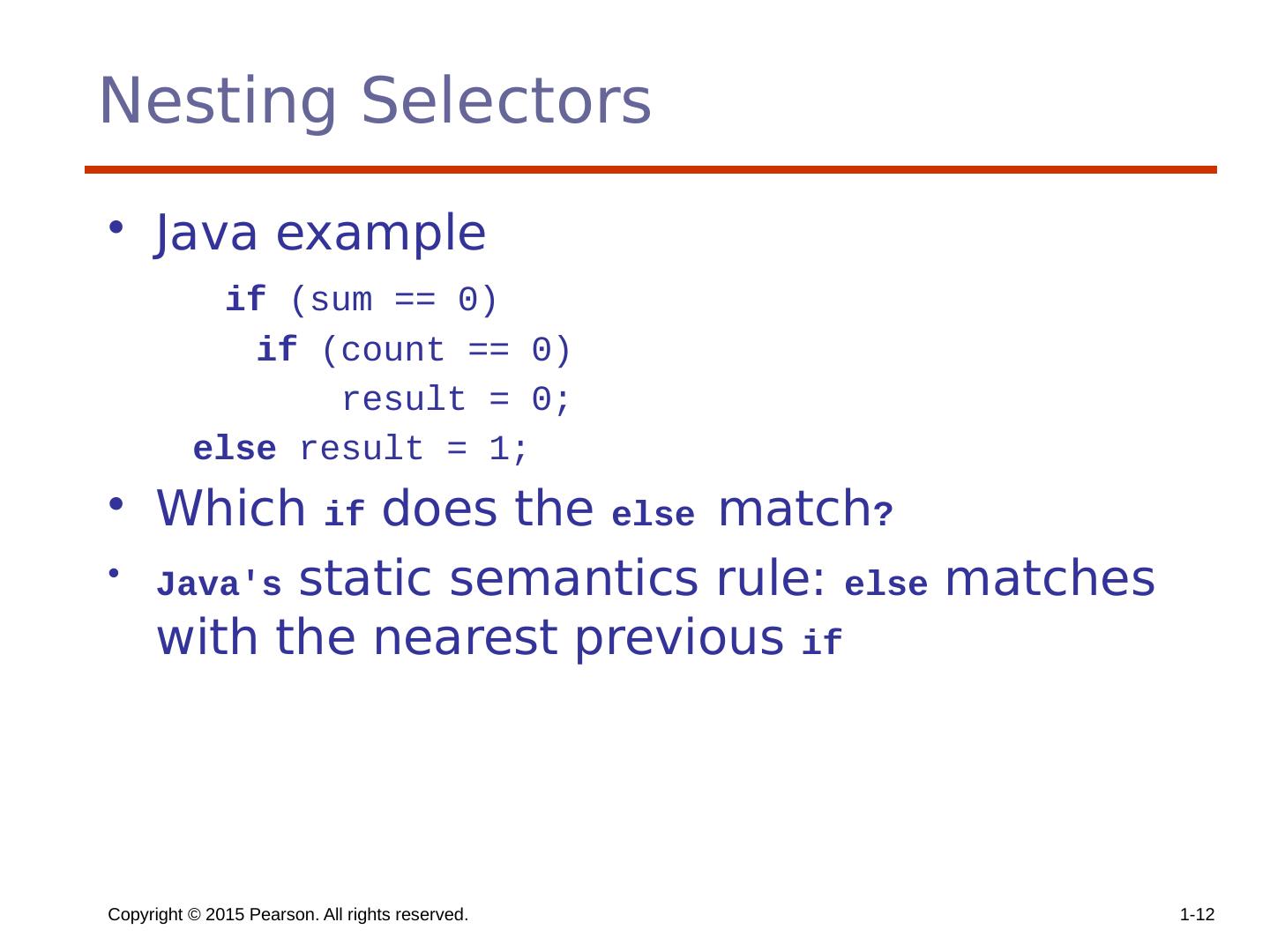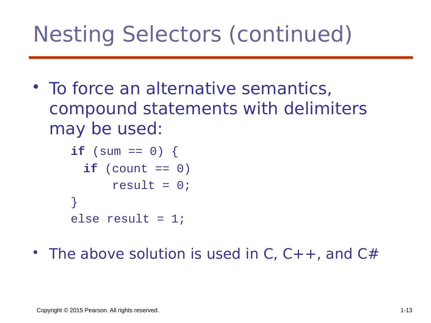 13 .Copyright © 2015 Pearson. All rights reserved. 1- 13 Nesting Selectors (continued) To force an alternative semantics, compound statements with delimiters may be used: if (sum == 0) { if (count == 0) result = 0; } else result = 1; The above solution is used in C, C++, and C#