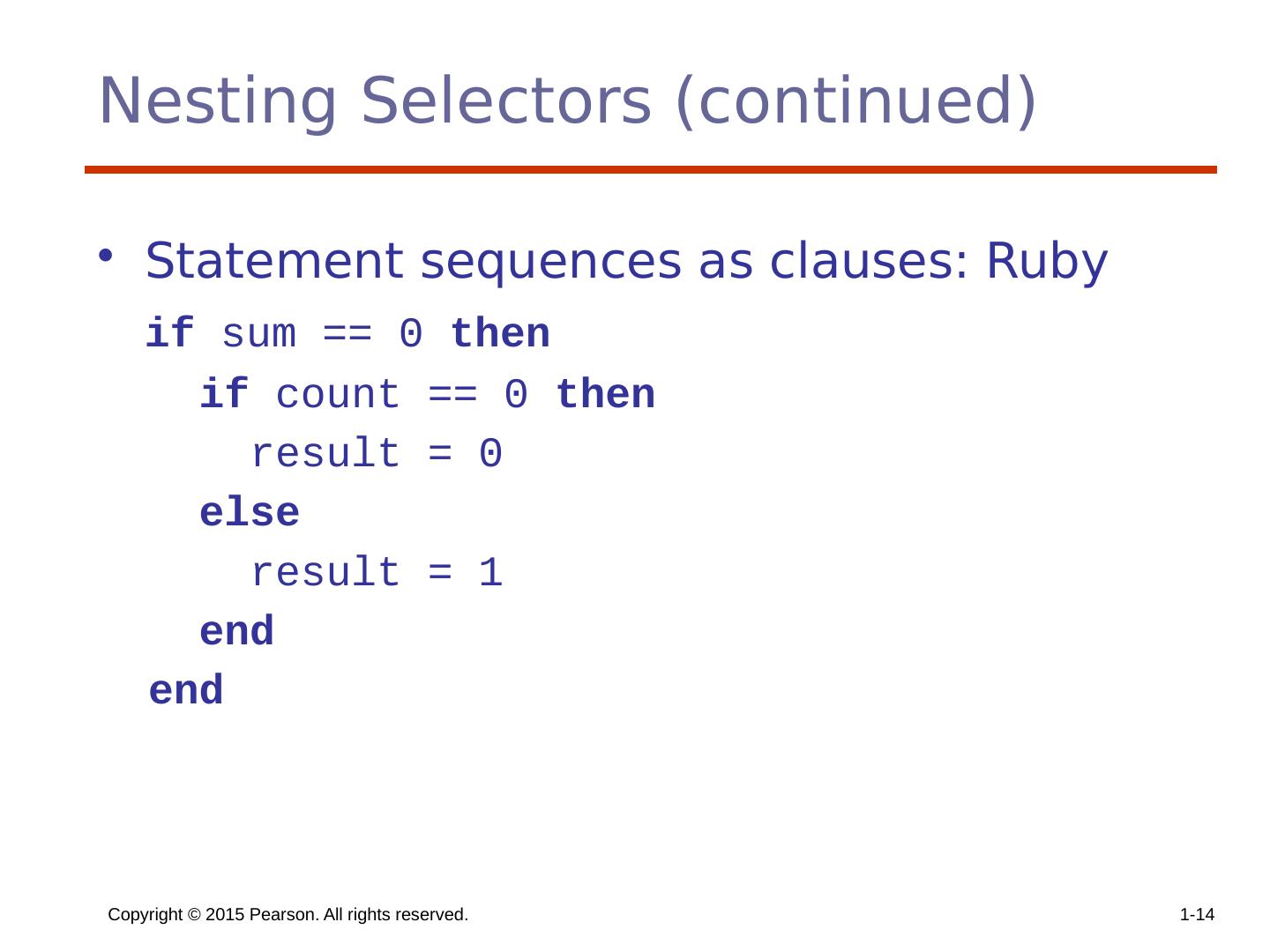 14 .Copyright © 2015 Pearson. All rights reserved. 1- 14 Nesting Selectors (continued) Statement sequences as clauses: Ruby if sum == 0 then if count == 0 then result = 0 else result = 1 end end