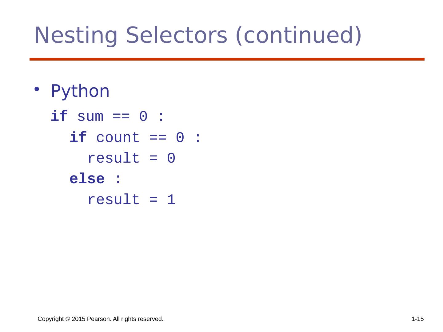 15 .Copyright © 2015 Pearson. All rights reserved. 1- 15 Nesting Selectors (continued) Python if sum == 0 : if count == 0 : result = 0 else : result = 1