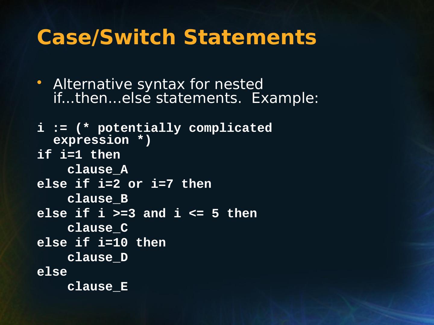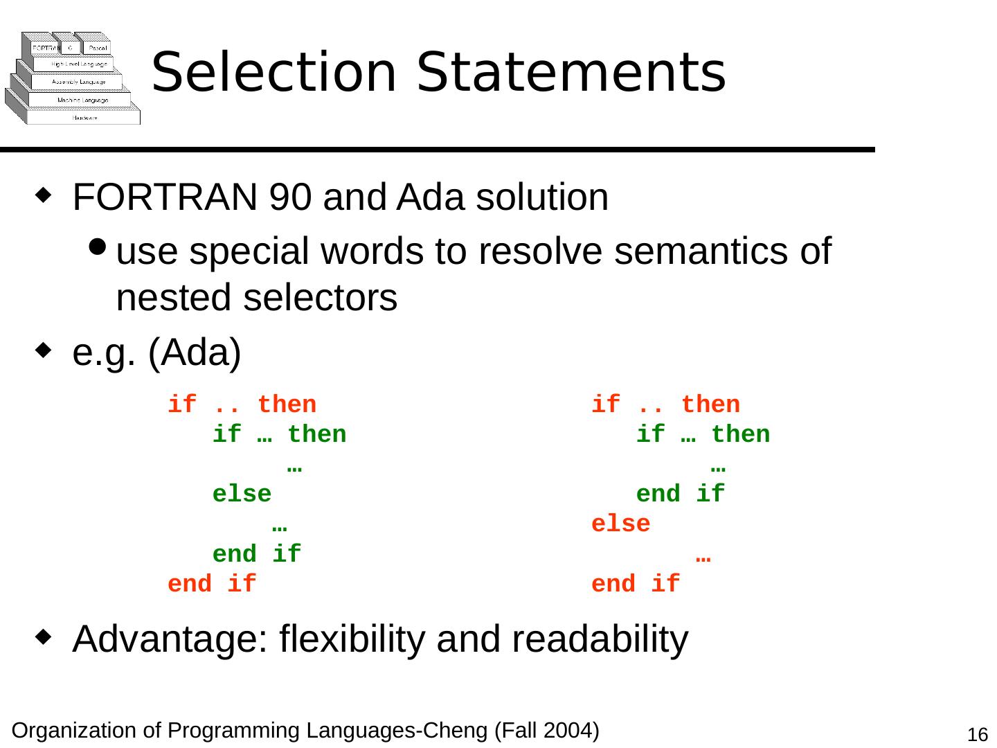 16 .Selection Statements FORTRAN 90 and Ada solution use special words to resolve semantics of nested selectors e.g. (Ada) Advantage: flexibility and readability if .. then if … then … end if else … end if if .. then if … then … else … end if end if