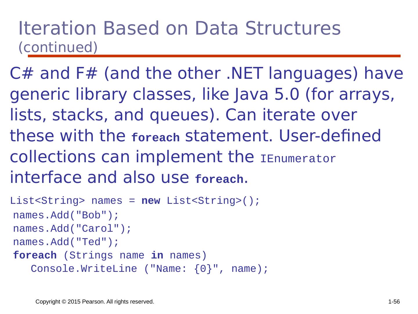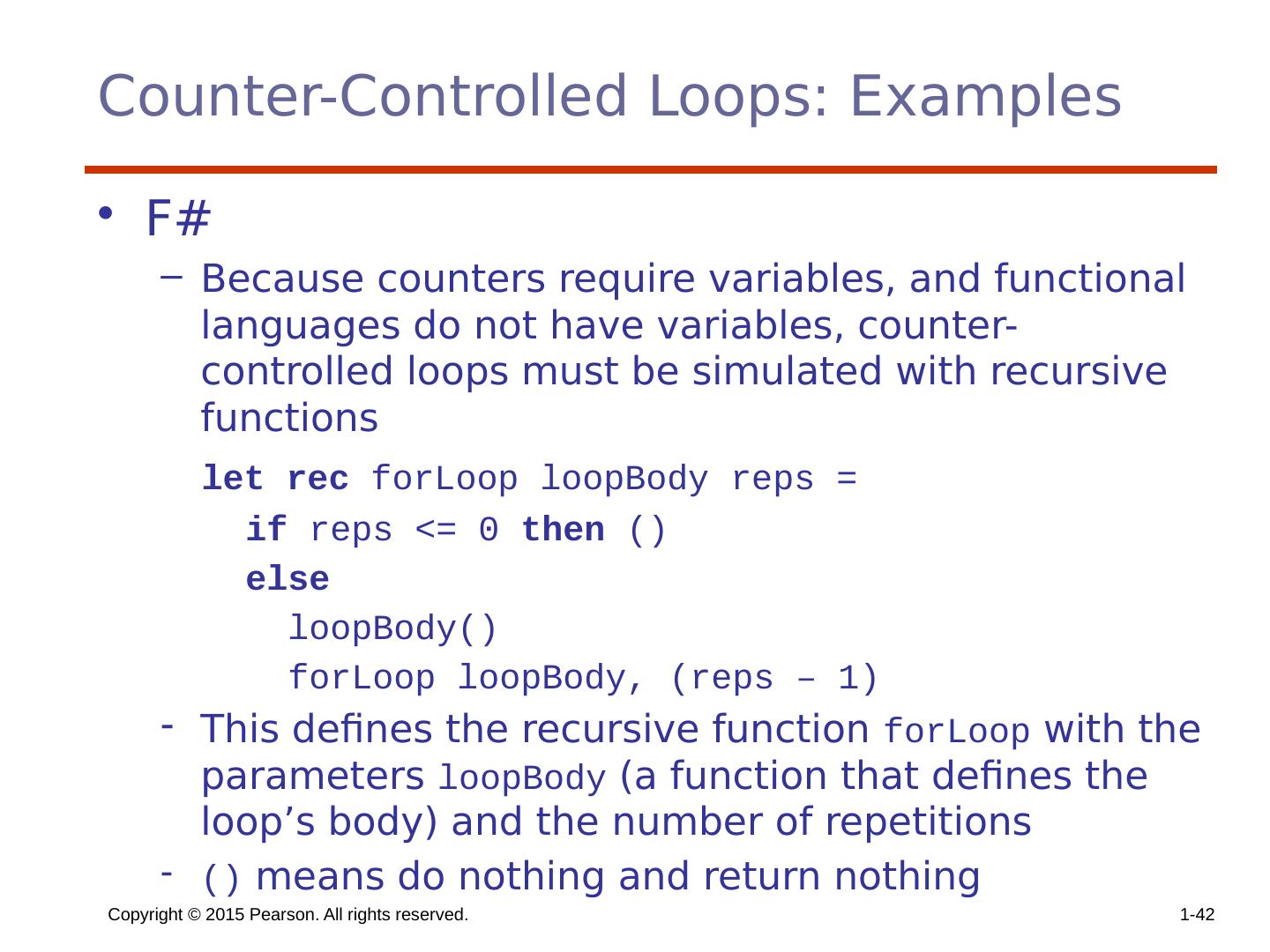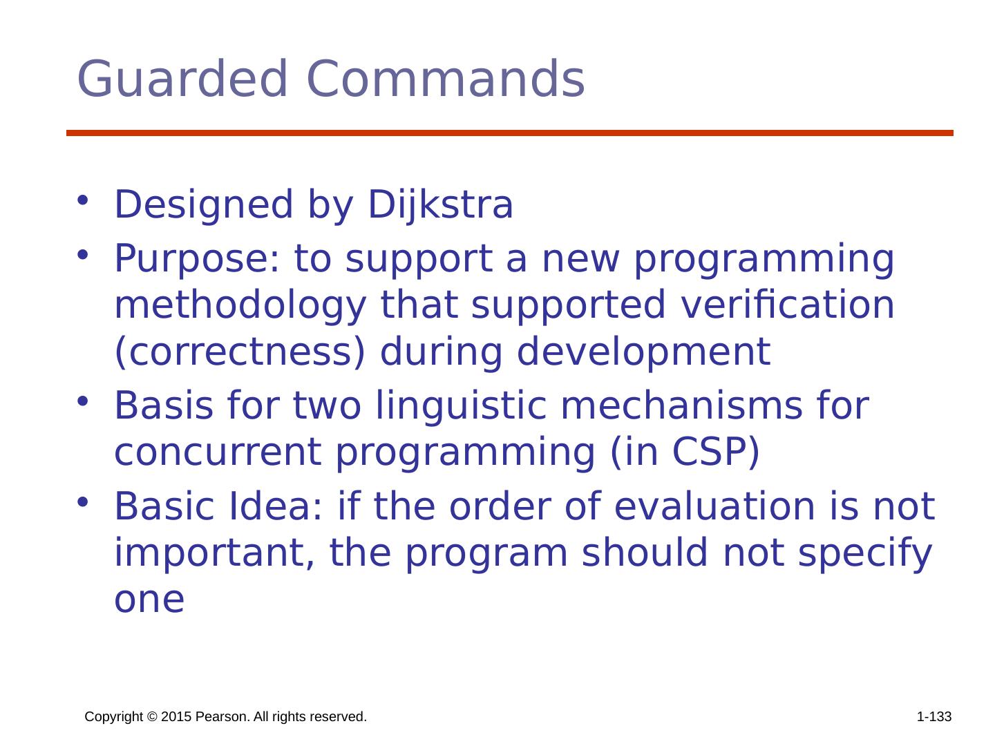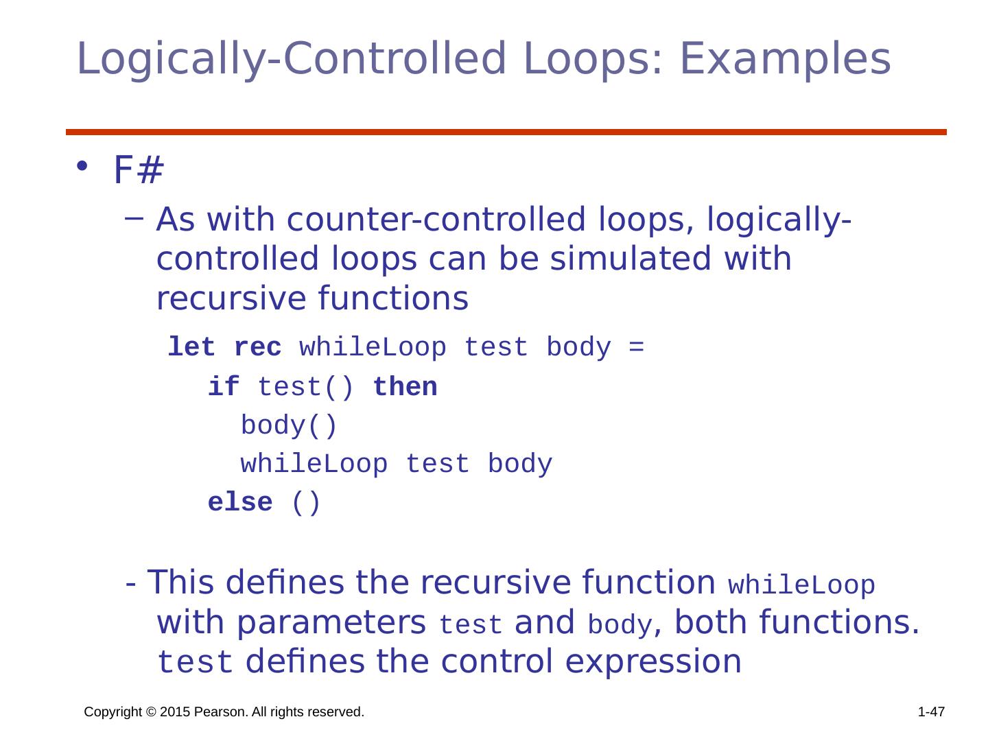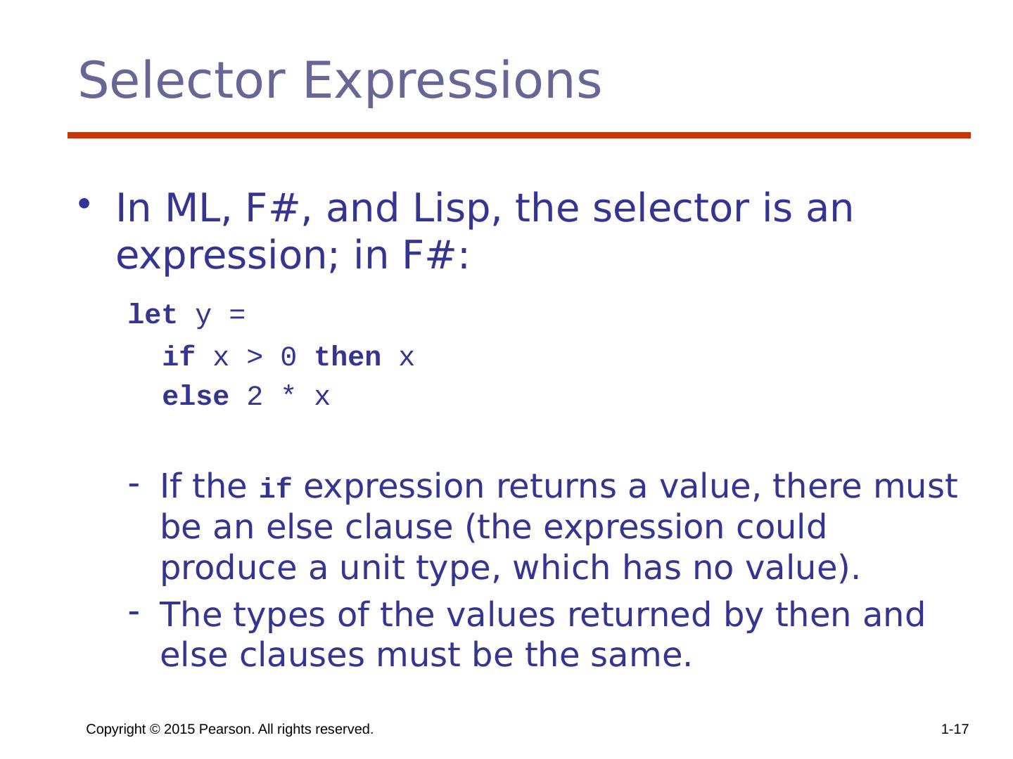 17 .Selector Expressions In ML, F#, and Lisp, the selector is an expression; in F#: let y = if x > 0 then x else 2 * x If the if expression returns a value, there must be an else clause (the expression could produce a unit type, which has no value). The types of the values returned by then and else clauses must be the same. Copyright © 2015 Pearson. All rights reserved. 1- 17