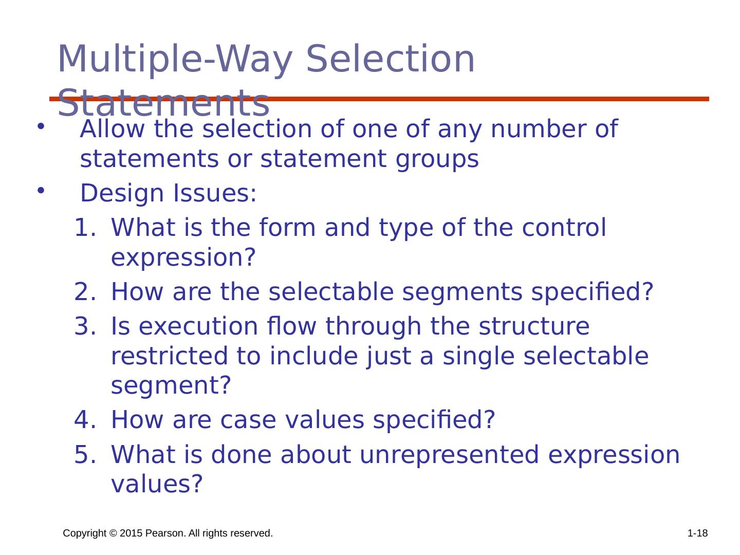 18 .Copyright © 2015 Pearson. All rights reserved. 1- 18 Multiple-Way Selection Statements Allow the selection of one of any number of statements or statement groups Design Issues: What is the form and type of the control expression? How are the selectable segments specified? Is execution flow through the structure restricted to include just a single selectable segment? How are case values specified? What is done about unrepresented expression values?