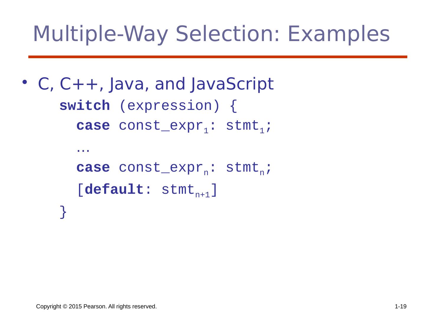 19 .Copyright © 2015 Pearson. All rights reserved. 1- 19 Multiple-Way Selection: Examples C, C++, Java, and JavaScript switch (expression) { case const_expr 1 : stmt 1 ; … case const_expr n : stmt n ; [ default : stmt n+1 ] }