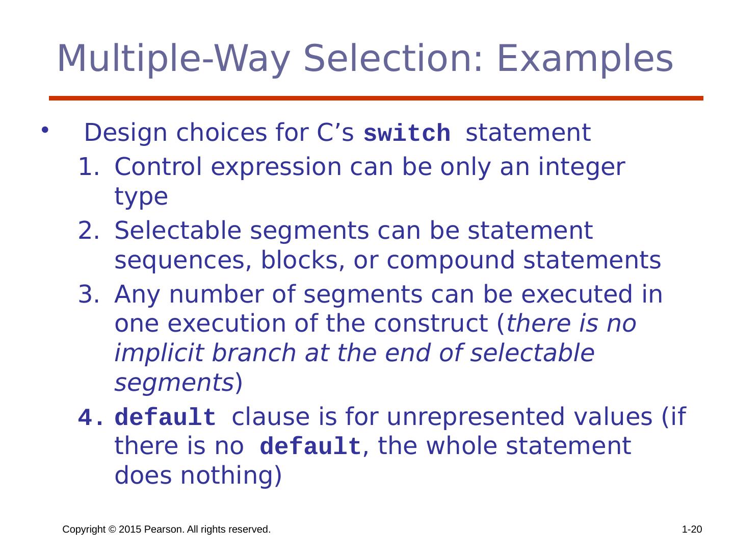 20 .Copyright © 2015 Pearson. All rights reserved. 1- 20 Multiple-Way Selection: Examples Design choices for C’s switch statement Control expression can be only an integer type Selectable segments can be statement sequences, blocks, or compound statements Any number of segments can be executed in one execution of the construct ( there is no implicit branch at the end of selectable segments ) default clause is for unrepresented values (if there is no default , the whole statement does nothing)