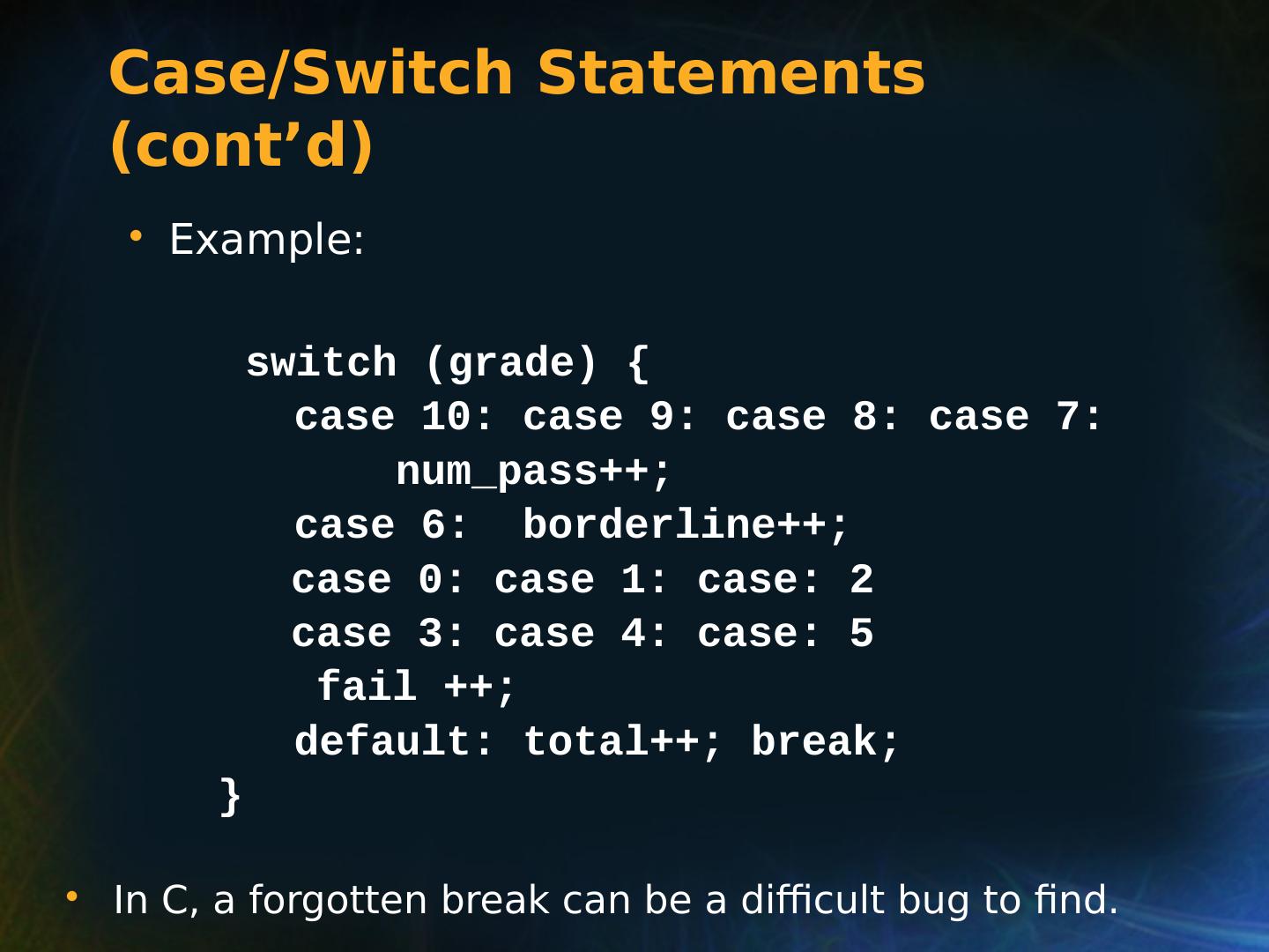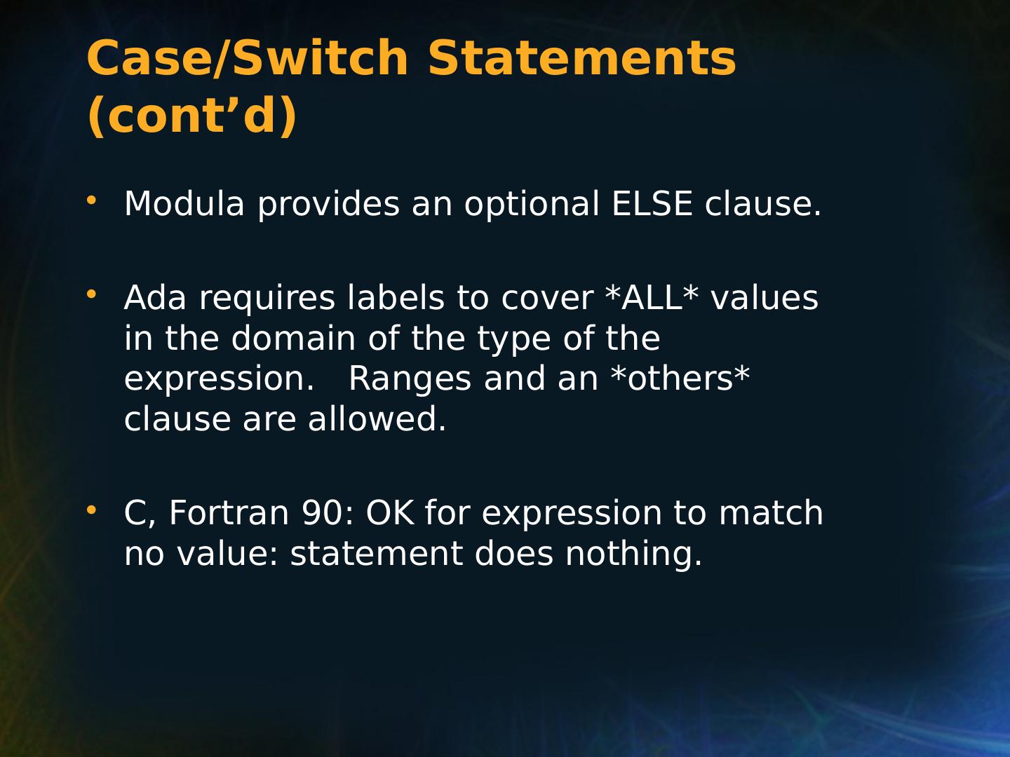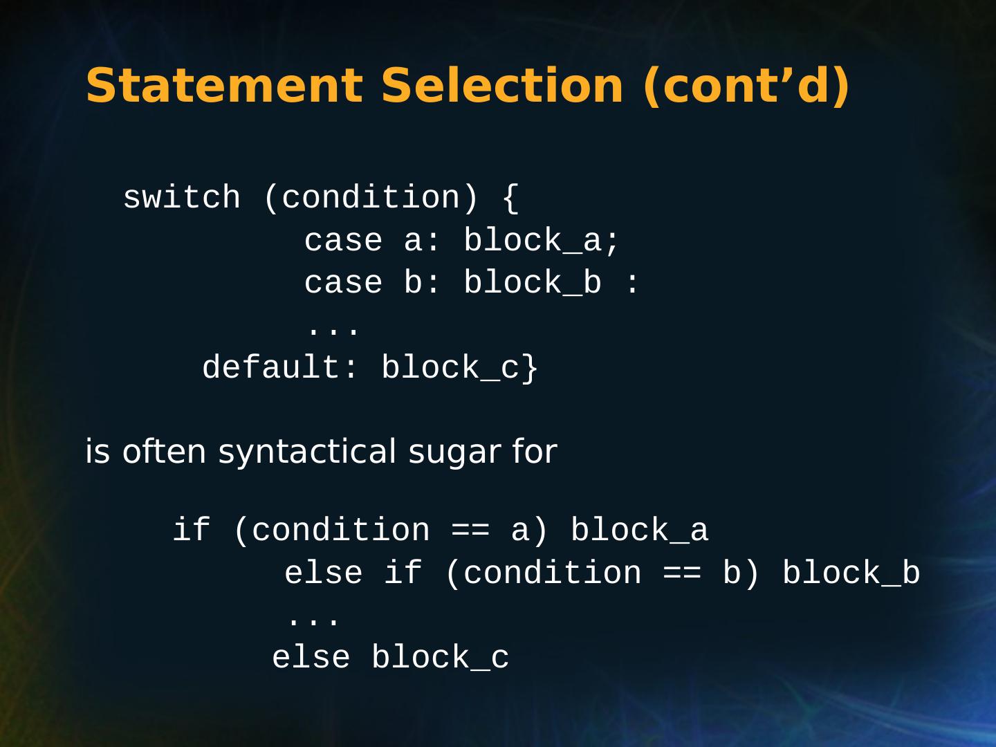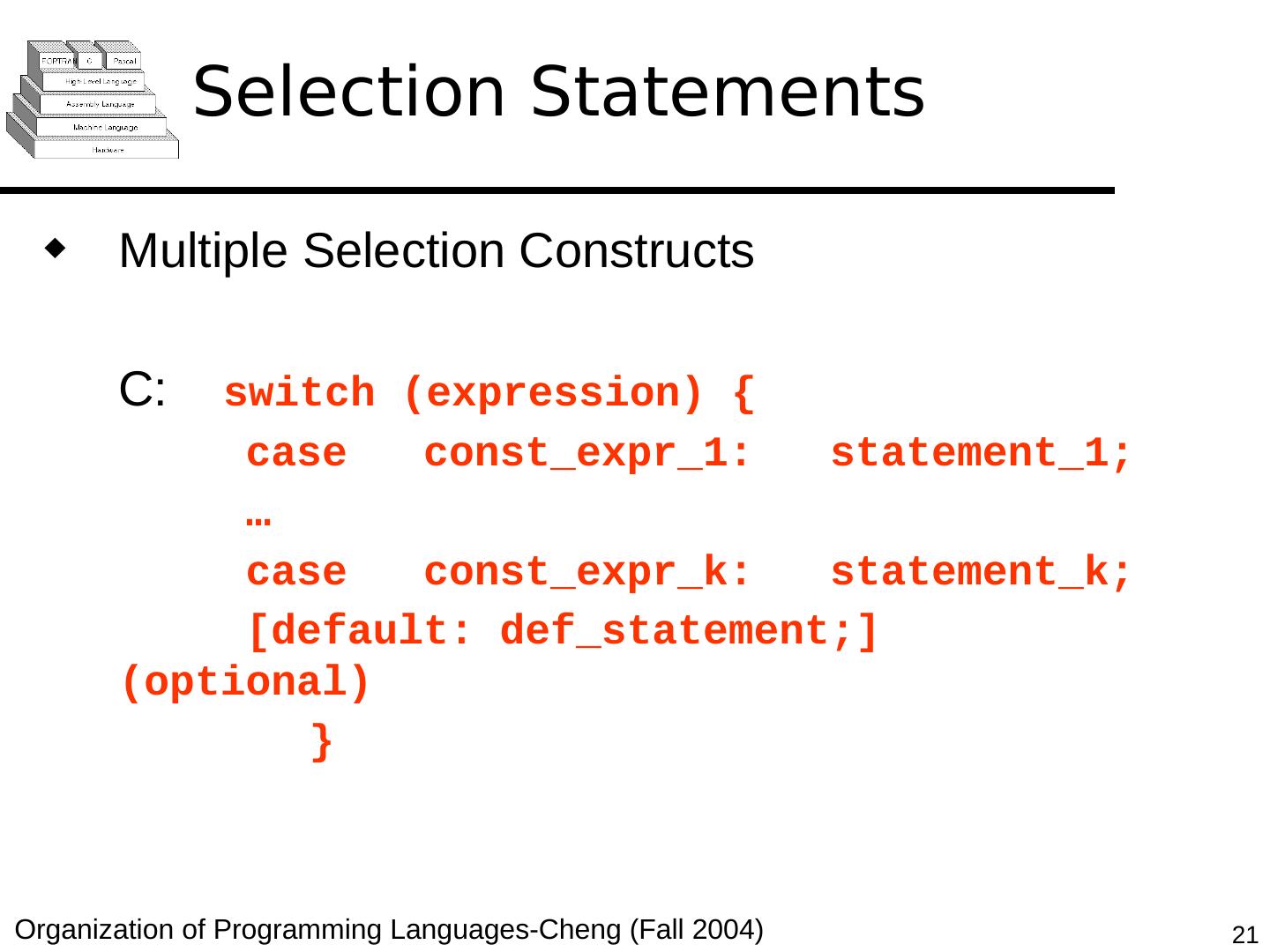 21 .Selection Statements Multiple Selection Constructs C: switch (expression) { case const_expr_1: statement_1; … case const_expr_k: statement_k; [default: def_statement;] (optional) }