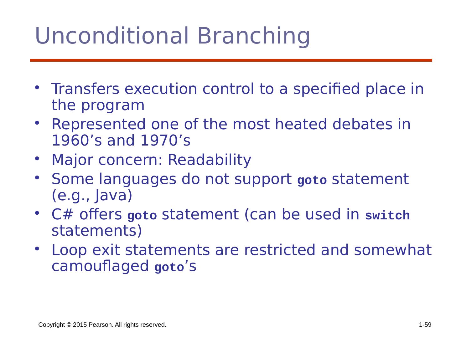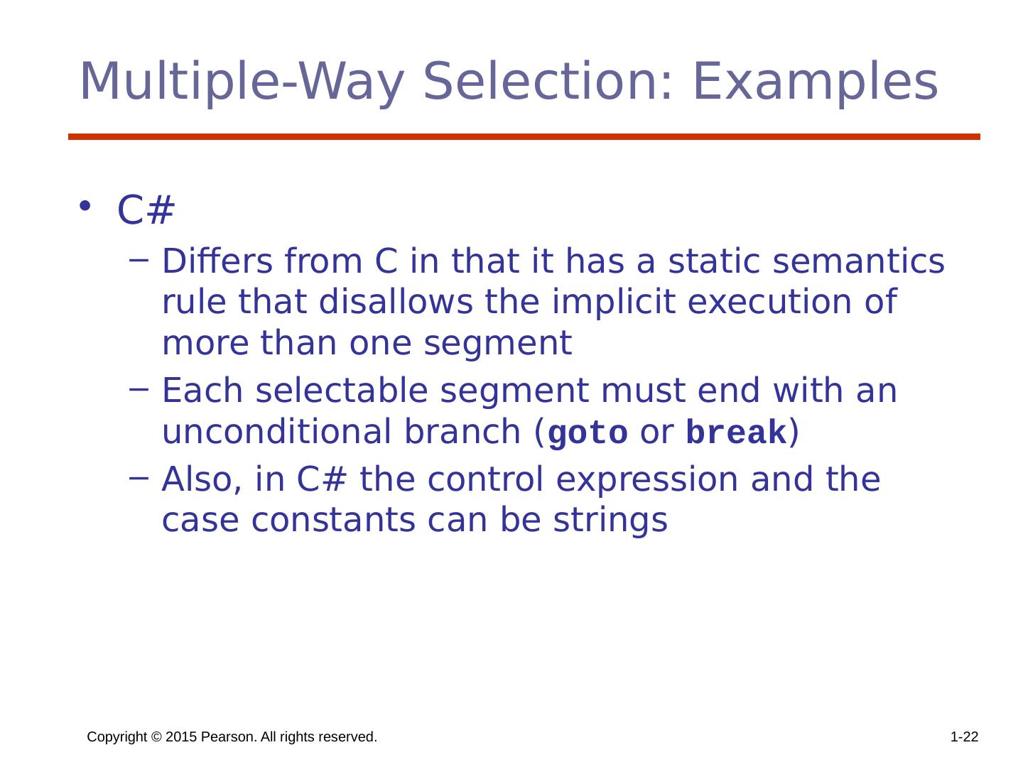 22 .Copyright © 2015 Pearson. All rights reserved. 1- 22 Multiple-Way Selection: Examples C# Differs from C in that it has a static semantics rule that disallows the implicit execution of more than one segment Each selectable segment must end with an unconditional branch ( goto or break ) Also, in C# the control expression and the case constants can be strings