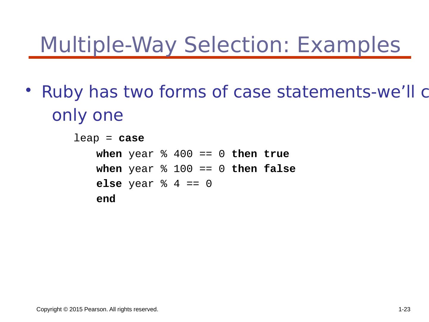 23 .Copyright © 2015 Pearson. All rights reserved. 1- 23 Multiple-Way Selection: Examples Ruby has two forms of case statements-we’ll cover only one leap = case when year % 400 == 0 then true when year % 100 == 0 then false else year % 4 == 0 end